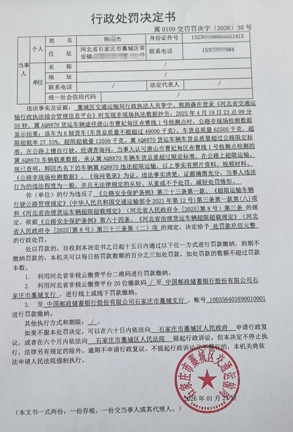| 韩*杰 | 自然人 | 身份证 | 132302********141X | 冀0109交罚罚决字【2026】30号 | 《公路安全保护条例》第三十三条第一款、《超限运输车辆行驶公路管理规定》(中华人民共和国交通运输部令2021年第12号)第三条第一款第(五)项、《河北省治理货运车辆超限超载规定》(河北省人民政府令【2025】第8号第三条) | 韩*杰名下冀AQ8870违法超限运输的案 | 《公路安全保护条例》第六十四条、《河北省治理货运车辆超限超载规定》(河北省人民政府令【2025】第8号)第三十三条第(二)项 | 罚款 | 0.09 | 2026.1.27 | 藁城区交通运输局 | FA06-002-15 |