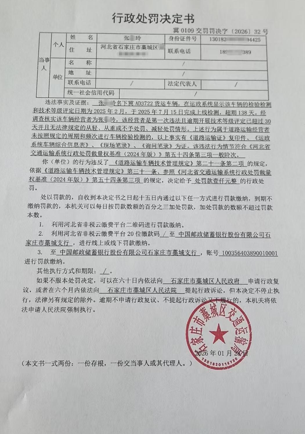 | 张*玲 | 自然人 | 身份证 | 189*********7389 | 冀0109交罚罚决字【2026】32号 | 《道路运输车辆技术管理规定》第二十一条第二项 | 张*玲名下冀AD3722未按照规定的周期和频次进行车辆检验检测的案 | 《道路运输车辆技术管理规定》第三十一条、参照《河北省交通运输系统行政处罚裁量权基准(2024年版)》第五十四条第三项 | 罚款 | 0.1 | 2026.1.28 | 藁城区交通运输局 | FA06-002-15 |