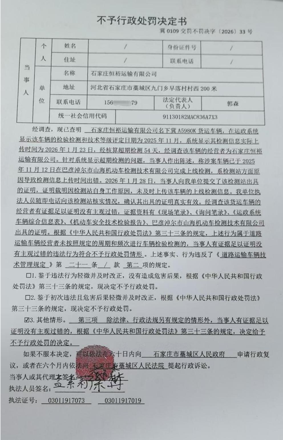 | 石家庄恒裕运输有限公司 | 法人 | 91130182MAC836A7X3 | 郭森 | 身份证 | 130182********0015 | 冀0109交罚不罚决字〔2026〕33号 | 《道路运输车辆技术管理规定》第二十一条第二项 | 石家庄恒裕运输有限公司名下冀A5980K未按照周期和频次进行车辆检验检测的案 | 不予处罚 | 2026.1.28 | 藁城区交通运输局 | FA06-002-15 |