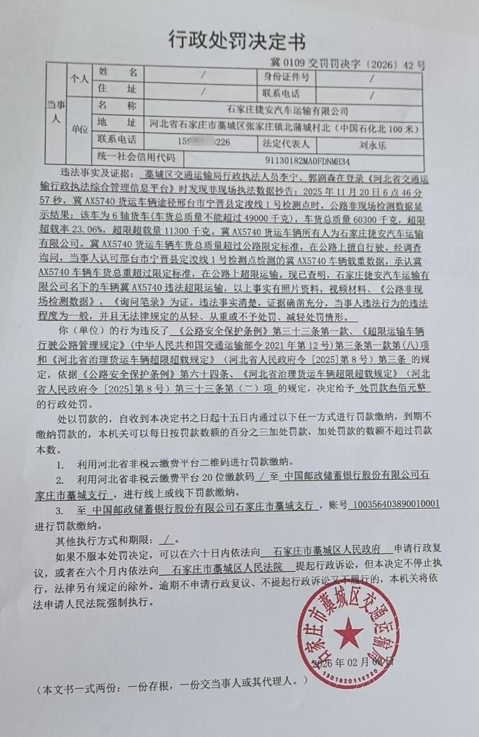 | 石家庄捷安汽车运输有限公司 | 法人 | 91130182MA0FDNMH34 | 刘永乐 | 身份证 | 130182********5353 | 冀0109交罚罚决字【2026】42号 | 《公路安全保护条例》第三十三条第一款、《超限运输车辆行驶公路管理规定》(中华人民共和国交通运输部令2021年12号)第三条第一款第(八)项和《河北省治理货运车辆超限超载规定》(河北省人民政府令【2025】第8号)第三条 | 石家庄捷安汽车运输有限公司名下冀AX5740涉嫌车货总质量超过公路限定标准,在公路上擅自行驶的案 | 《公路安全保护条例》第六十四条、《河北省治理货运车辆超限超载规定》(河北省人民政府令【2025】第8号)第三十三条第(二)项 | 罚款 | 0.03 | 2026.02.06 | 藁城区交通运输局 | FA06-002-15 |