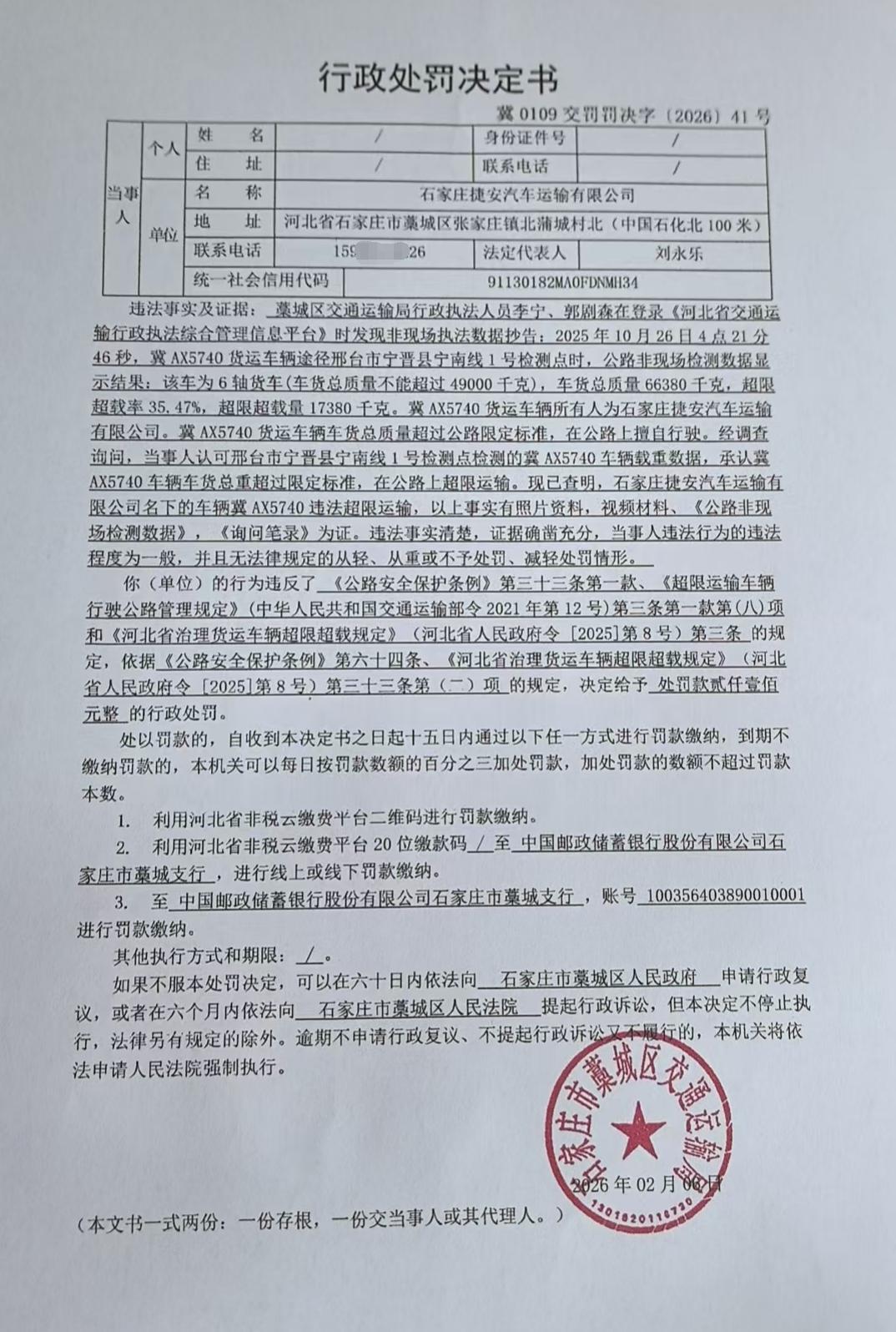 | 石家庄捷安汽车运输有限公司 | 法人 | 91130182MA0FDNMH34 | 刘永乐 | 身份证 | 130182********5353 | 冀0109交罚罚决字【2026】41号 | 《公路安全保护条例》第三十三条第一款、《超限运输车辆行驶公路管理规定》(中华人民共和国交通运输部令2021年12号)第三条第一款第(八)项和《河北省治理货运车辆超限超载规定》(河北省人民政府令【2025】第8号)第三条 | 石家庄捷安汽车运输有限公司名下冀AX5740涉嫌车货总质量超过公路限定标准,在公路上擅自行驶的案 | 《公路安全保护条例》第六十四条、《河北省治理货运车辆超限超载规定》(河北省人民政府令【2025】第8号)第三十三条第(二)项 | 罚款 | 0.21 | 2026.02.06 | 藁城区交通运输局 | FA06-002-15 |