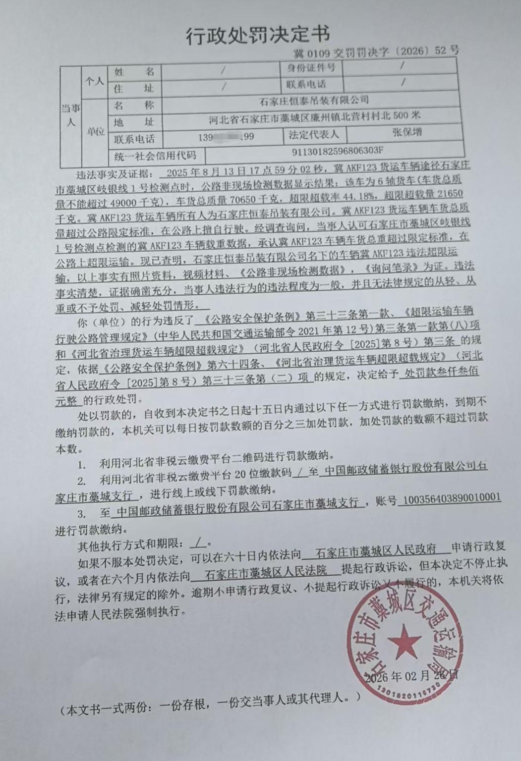 | 石家庄恒泰吊装有限公司 | 法人 | 91130182596806303F | 张保增 | 身份证 | 132325********0312 | 冀0109交罚罚决字【2026】52号 | 《公路安全保护条例》第三十三条第一款、《超限运输车辆行驶公路管理规定》(中华人民共和国交通运输部令2021年12号)第三条第一款第(六)项和《河北省治理货运车辆超限超载规定》(河北省人民政府令【2025】第8号)第三条 | 石家庄恒泰吊装有限公司名下冀AKF123涉嫌车货总质量超过公路限定标准,在公路上擅自行驶的案 | 《公路安全保护条例》第六十四条、《河北省治理货运车辆超限超载规定》(河北省人民政府令【2025】第8号)第三十三条第(二)项 | 罚款 | 0.33 | 2026.02.26 | 藁城区交通运输局 | FA06-002-15 |