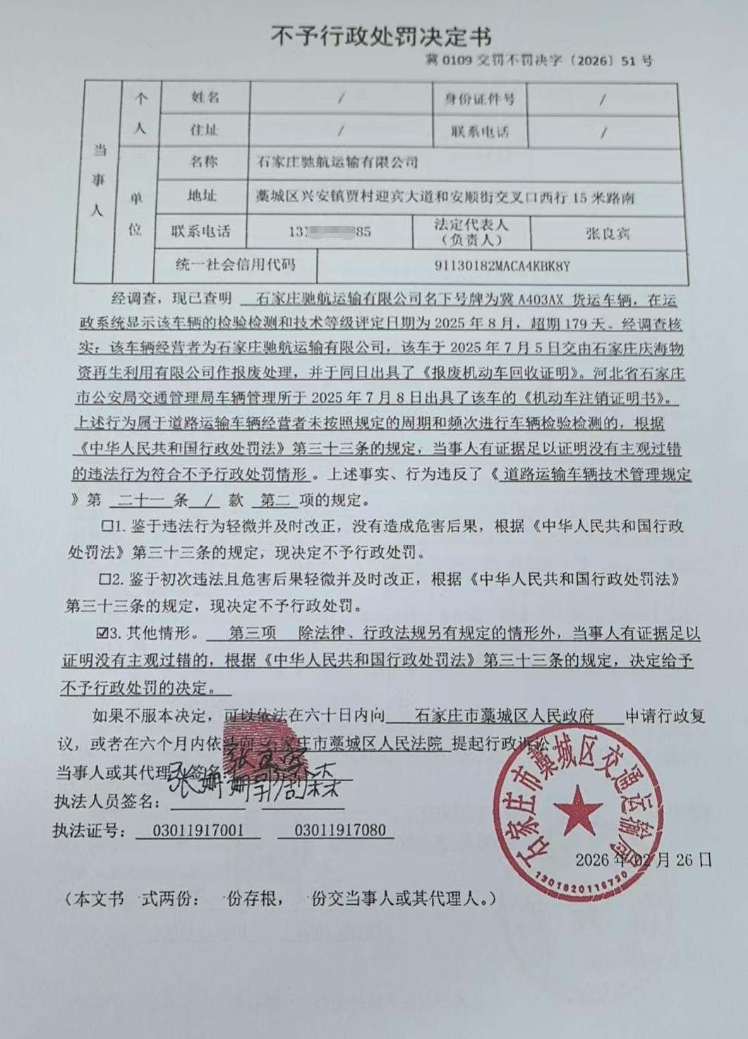 藁城区交通运输局行政处罚公示冀0109交罚不罚决字〔2026〕51号