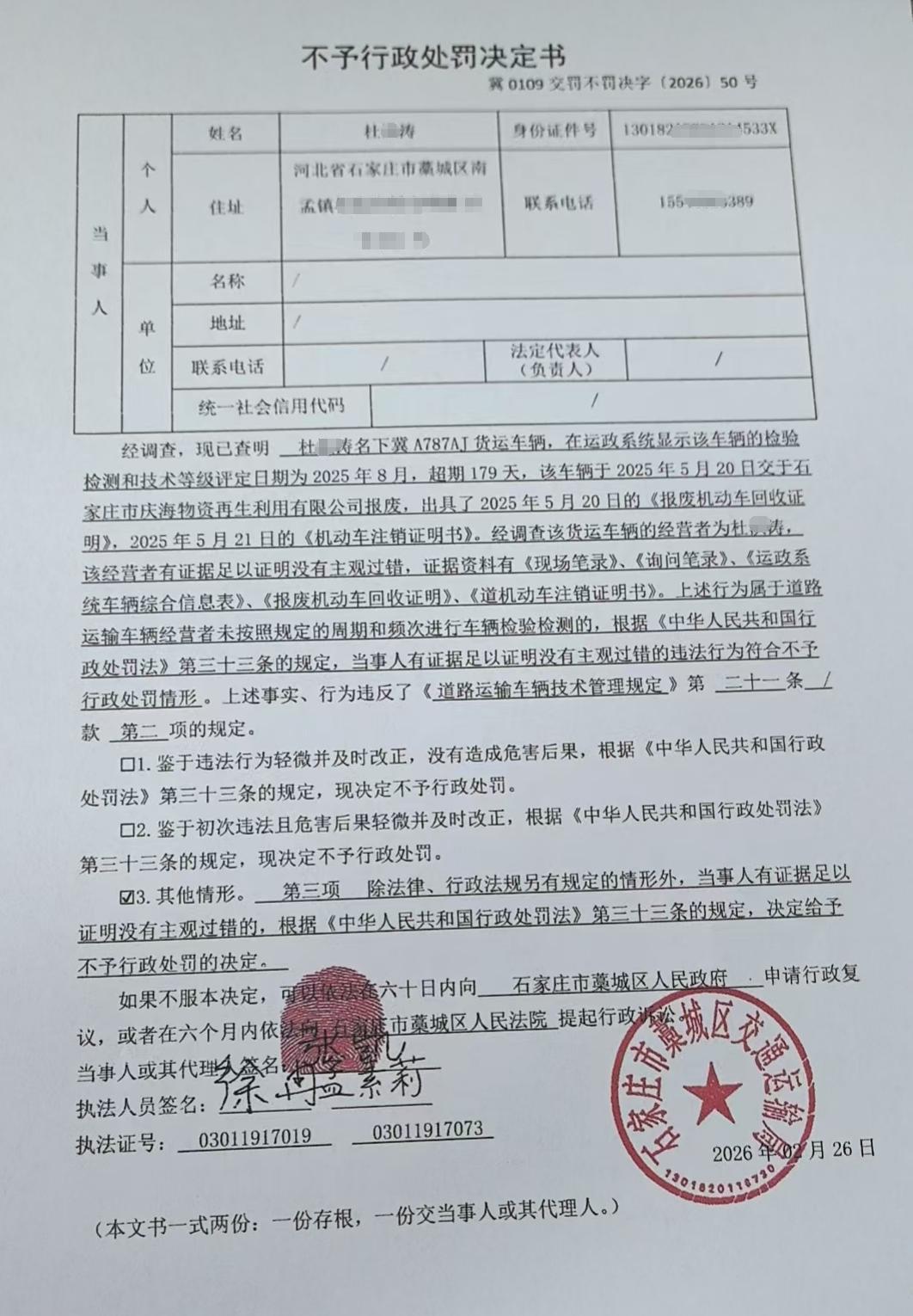| 杜*涛 | 自然人 | 身份证 | 130182*********533X | 冀0109交罚不罚决字〔2026〕50号 | 《道路运输车辆技术管理规定》第二十一条第二项 | 杜*涛名下冀787AJ未按照规定的周期和频次进行车辆检验检测的案 | 依据《道路运输车辆技术管理规定》第三十一条,参照《中华人民共和国行政处罚法》第五十四条第三项的规定 | 不予处罚 | 2026.02.26 | 藁城区交通运输局 | FA06-002-15 |
