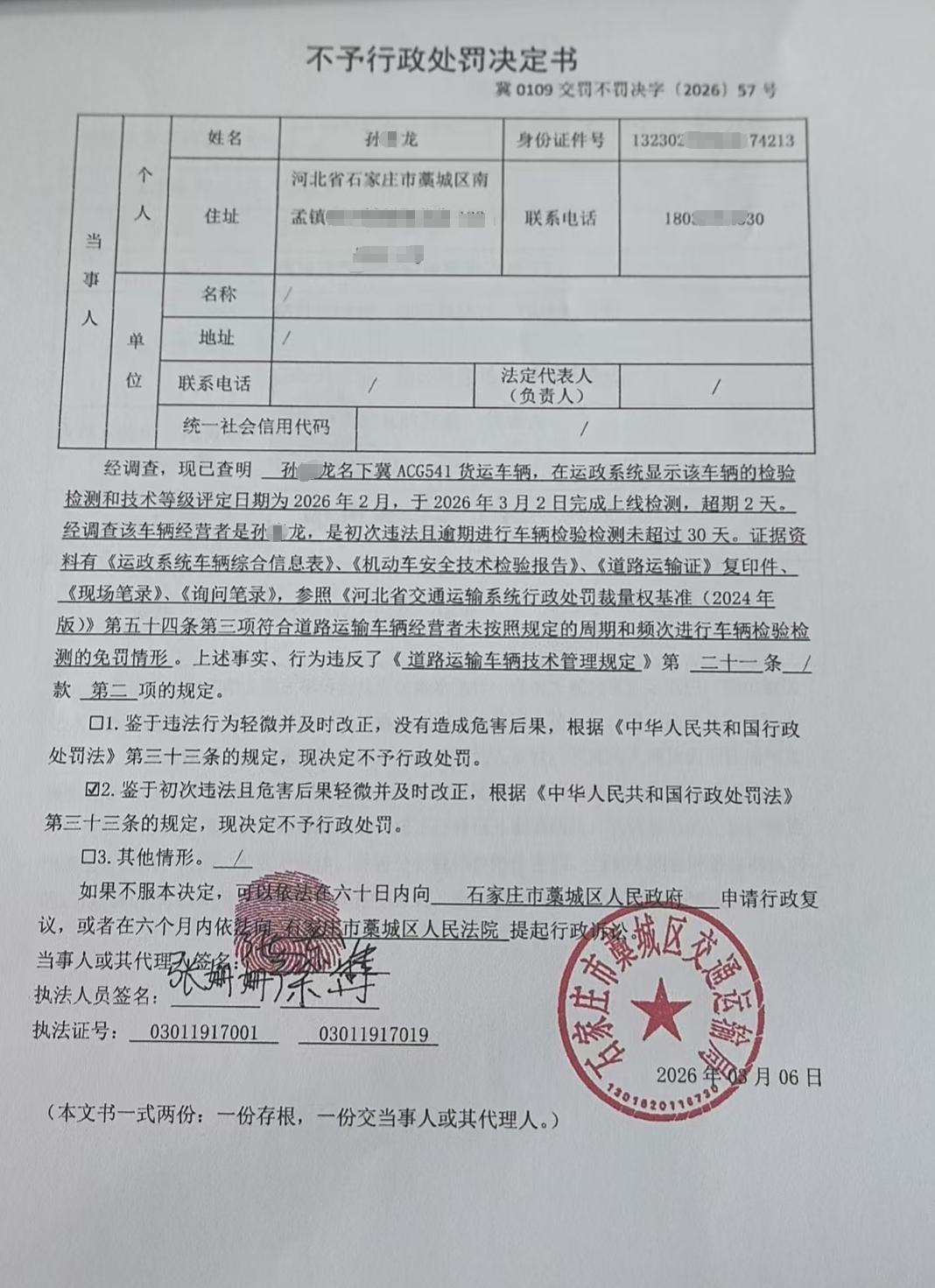 | 孙*龙 | 自然人 | 身份证 | 132302********4213 | 冀0109交罚不罚决字〔2026〕57号 | 《道路运输车辆技术管理规定》第二十一条第二项 | 孙*龙名下冀ACG541未按照规定的周期和频次进行车辆检验检测的案 | 依据《道路运输车辆技术管理规定》第三十一条,参照《中华人民共和国行政处罚法》第五十四条第三项的规定 | 不予处罚 | 2026.3.6 | 藁城区交通运输局 | FA06-002-15 |