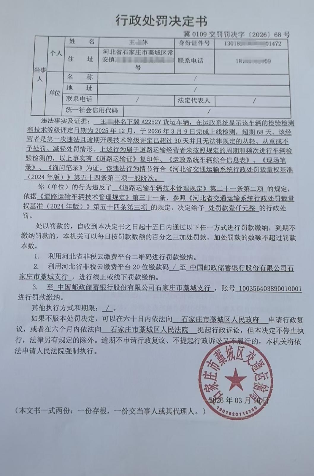 | 王*林 | 自然人 | 身份证 | 130182********1472 | 冀0109交罚罚决字【2026】68号 | 《道路运输车辆技术管理规定》第二十一条第二项 | 王*林名下冀A2252Y未按照规定的周期和频次进行车辆检验检测的案 | 《道路运输车辆技术管理规定》第三十一条、参照《河北省交通运输系统行政处罚裁量权基准(2024年版)》第五十四条第三项 | 罚款 | 0.1 | 2026.03.16 | 藁城区交通运输局 | FA06-002-15 |