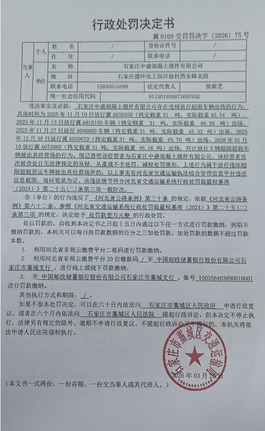 | 石家庄中盛混凝土搅拌有限公司 | 法人 | 91130193087269765G | 徐新芝 | 身份证 | 132325********3024 | 冀0109交罚罚决字【2026】75号 | 《河北省公路条例》第三十条 | 石家庄中盛混凝土搅拌有限公司涉嫌放行违法超限超载货运车辆驶出其经营场所案 | 《河北省公路条例》第六十二条、《河北省交通运输交通系统行政处罚裁量权基准(2024)》第二十五(二)条第三项 | 罚款 | 1 | 2026.03.20 | 藁城区交通运输局 | FA06-002-15 |
