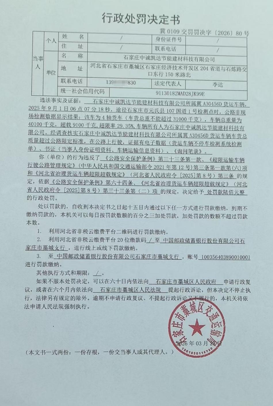 | 石家庄中诚凯达节能建材科技有限公司 | 法人 | 91130182MAD28JK99E | 李达 | 身份证 | 130105********2131 | 冀0109交罚罚决字【2026】80号 | 《公路安全保护条例》第三十三条第一款、《超限运输车辆行驶公路管理规定》(中华人民共和国交通运输部令2021年12号)第三条第一款第(六)项和《河北省治理货运车辆超限超载规定》(河北省人民政府令【2025】第8号)第三条 | 石家庄中诚凯达节能建材科技有限公司名下冀A30456D涉嫌车货总质量超过公路限定标准,在公路上擅自行驶的案 | 《公路安全保护条例》第六十四条、《河北省治理货运车辆超限超载规定》(河北省人民政府令【2025】第8号)第三十三条第(二)项 | 罚款 | 0.06 | 2026.03.25 | 藁城区交通运输局 | FA06-002-15 |