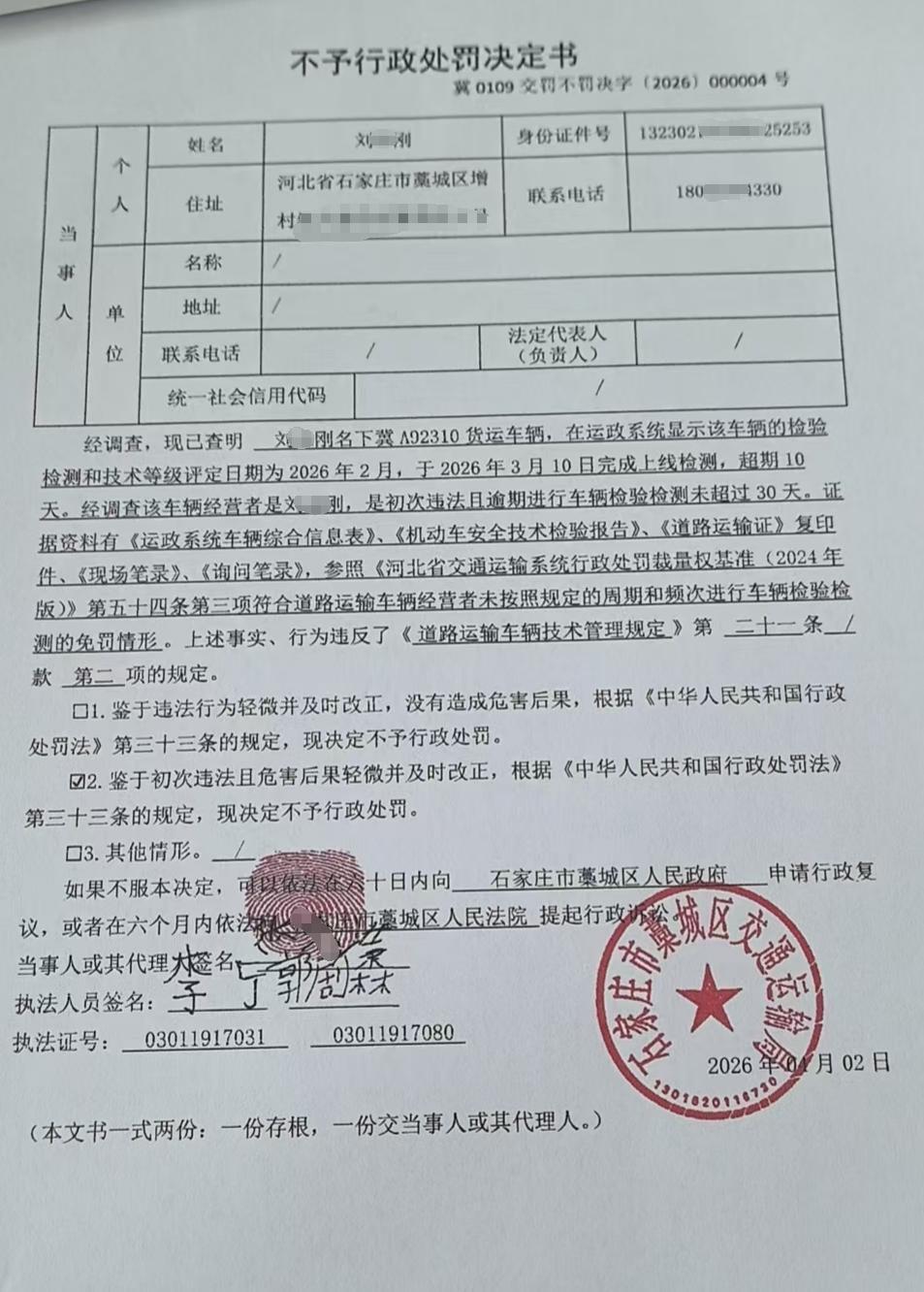 | 刘*刚 | 自然人 | 身份证 | 132302********5253 | 冀0109交罚不罚决字〔2026〕000004号 | 《道路运输车辆技术管理规定》第二十一条第二项 | 刘*刚名下冀A92310未按照规定的周期和频次进行车辆检验检测的案 | 依据《道路运输车辆技术管理规定》第二十一条,根据《中华人民共和国行政处罚法》第三十三条的规定的规定 | 不予处罚 | 2026.04.02 | 藁城区交通运输局 | FA06-002-15 |