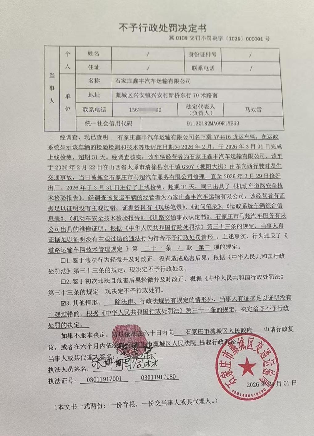 | 石家庄鑫丰汽车运输有限公司 | 法人 | 91130182MA09R1YE63 | 马双雪 | 身份证 | 132325********0625 | 冀0109交罚不罚决字〔2026〕000001号 | 《道路运输车辆技术管理规定》第二十一条第二项 | 石家庄鑫丰汽车运输有限公司名下冀AV4416未按照周期和频次进行车辆检验检测的案 | 不予处罚 | 2026.4.1 | 藁城区交通运输局 | FA06-002-15 |