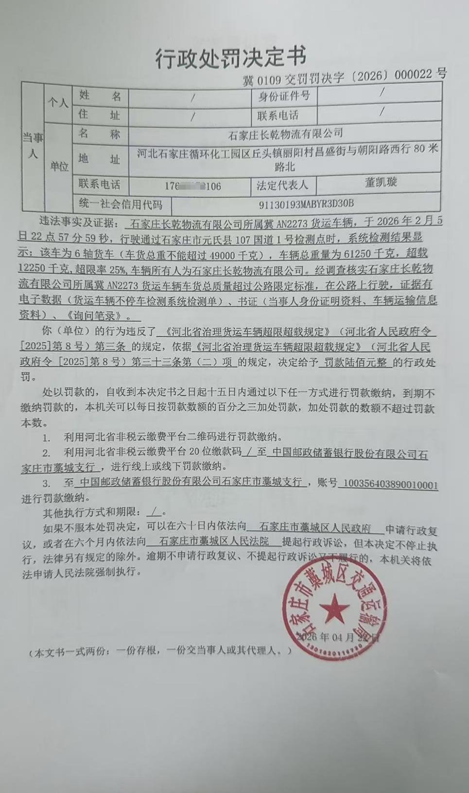 | 石家庄长乾物流有限公司 | 法人 | 91130193MABYR3D30B | 董凯璇 | 身份证 | 130132********0016 | 冀0109交罚罚决字【2026】000022号 | 《公路安全保护条例》第三十三条第一款、《超限运输车辆行驶公路管理规定》(中华人民共和国交通运输部令2021年12号)第三十三条第一款第(六)项、《河北省治理货运车辆超限超载规定》(河北省人民政府令【2025】第8号)第三条 | 石家庄长乾物流有限公司所属冀AN2273车货总质量超过公路限定标准,在公路上擅自行驶的案 | 《公路安全保护条例》第六十四条、《河北省治理货运车辆超限超载规定》(河北省人民政府令【2025】第8号第三十三条第(二)项 | 罚款 | 0.06 | 2026.04.22 | 藁城区交通运输局 | FA06-002-15 |