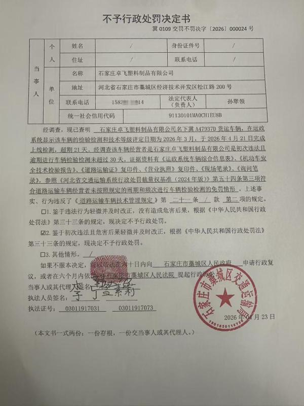 | 石家庄卓飞塑料制品有限公司 | 法人 | 91130101MA0CH1EU8B | 孙翠领 | 身份证 | 132302********0325 | 冀0109交罚不罚决字〔2026〕000024号 | 《道路运输车辆技术管理规定》第二十一条第二项 | 石家庄卓飞塑料制品有限公司名下冀 A47937D货运车辆未按照周期和频次进行车辆检验检测的案 | 不予处罚 | 2026.4.23 | 藁城区交通运输局 | FA06-002-15 |