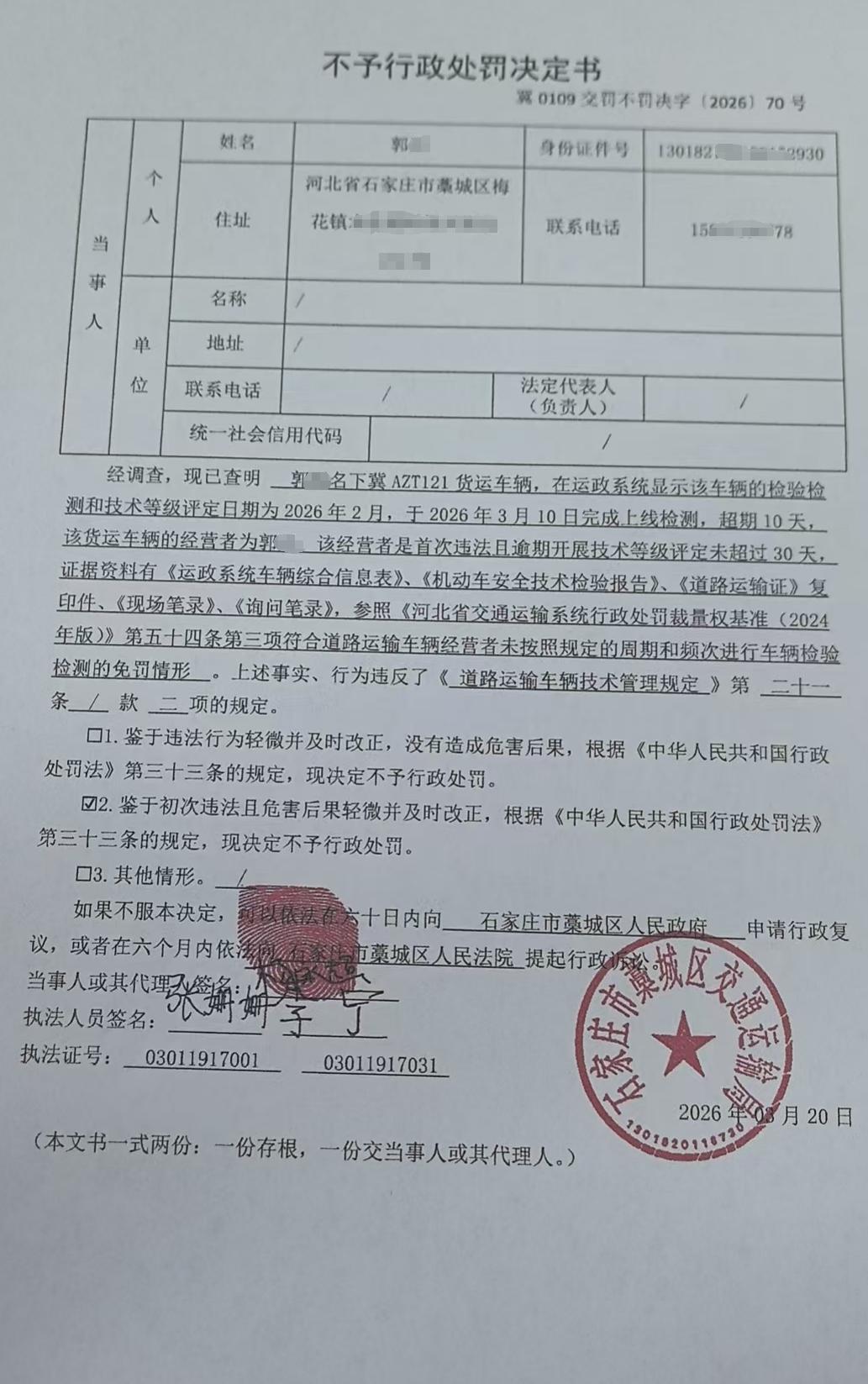 | 郭* | 自然人 | 身份证 | 130182********2930 | 冀0109交罚不罚决字〔2026〕70号 | 《道路运输车辆技术管理规定》第二十一条第二项 | 冀AZT121未按照规定的周期和频次进行车辆检验检测的案 | 依据《道路运输车辆技术管理规定》第三十一条,根据《中华人民共和国行政处罚法》第三十三条的规定的规定 | 不予处罚 | 2026.03.20 | 藁城区交通运输局 | FA06-002-15 |