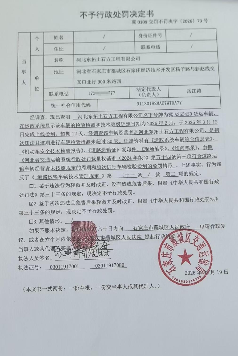 | 河北东拓土石方工程有限公司 | 法人 | 91130182MAE7WTDA7Y | 岳江涛 | 身份证 | 130182********3514 | 冀0109交罚不罚决字〔2026〕73号 | 《道路运输车辆技术管理规定》第二十一条第二项 | 河北东拓土石方工程有限公司名下冀A36543D未按照周期和频次进行车辆检验检测的案 | 不予处罚 | 2026.3.19 | 藁城区交通运输局 | FA06-002-15 |
