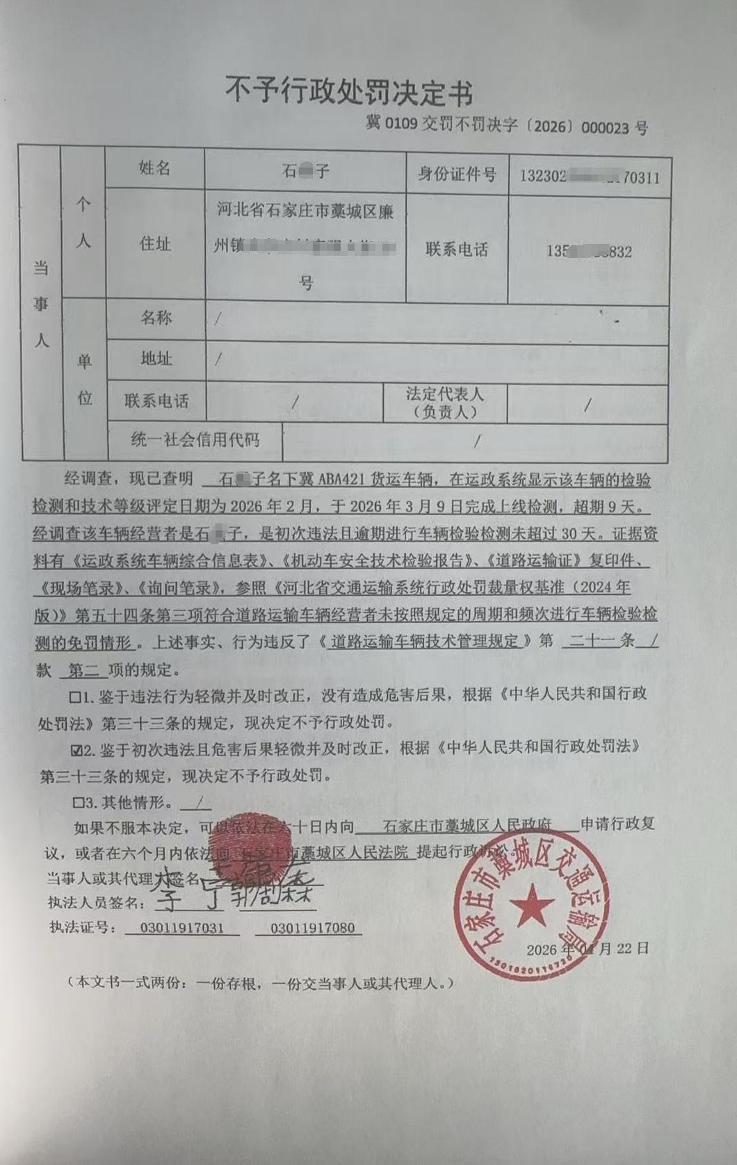 | 石*子 | 自然人 | 身份证 | 132302********0311 | 冀0109交罚不罚决字〔2026〕000023号 | 《道路运输车辆技术管理规定》第二十一条第二项 | 石*子名下冀ABA421未按照规定的周期和频次进行车辆检验检测的案 | 依据《道路运输车辆技术管理规定》第二十一条,根据《中华人民共和国行政处罚法》第三十三条的规定的规定 | 不予处罚 | 2026.04.22 | 藁城区交通运输局 | FA06-002-15 |