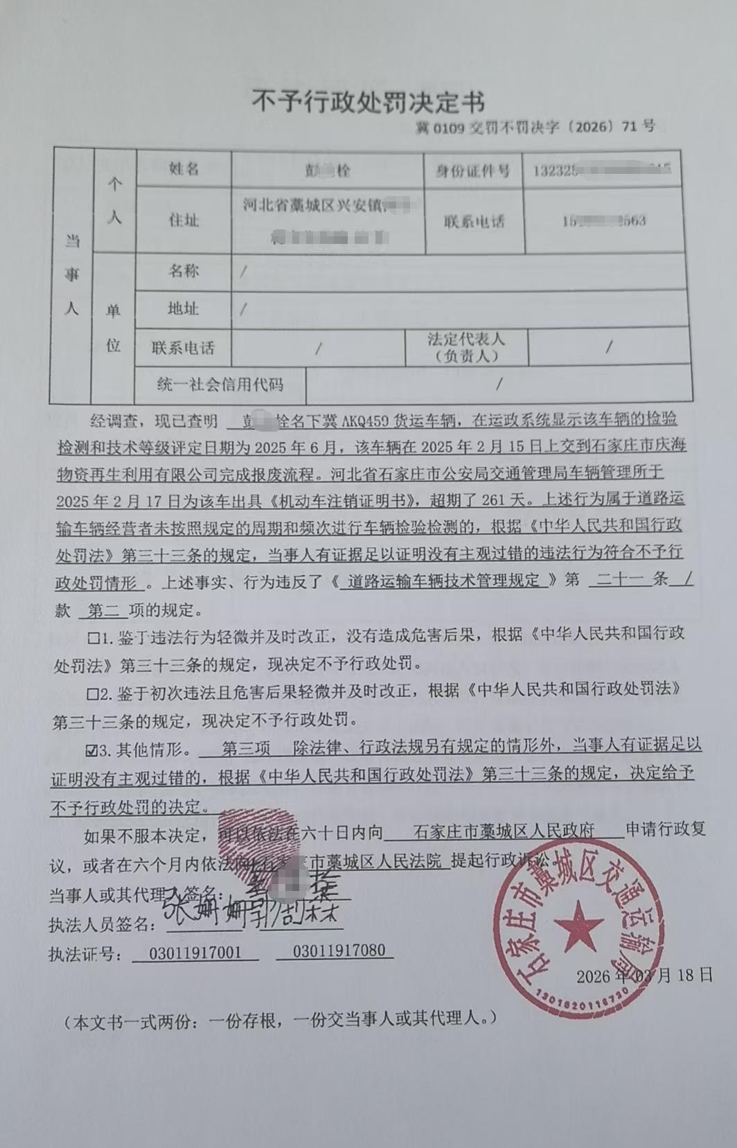 | 彭*栓 | 自然人 | 身份证 | 132325********1015 | 冀0109交罚不罚决字〔2026〕71号 | 《道路运输车辆技术管理规定》第二十一条第二项 | 彭*栓名下冀AKQ459未按照规定的周期和频次进行车辆检验检测的案 | 依据《道路运输车辆技术管理规定》第三十一条,根据《中华人民共和国行政处罚法》第三十三条的规定的规定 | 不予处罚 | 2026.03.18 | 藁城区交通运输局 | FA06-002-15 |