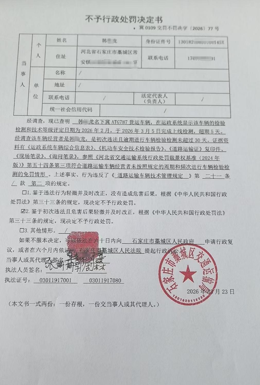 | 韩*龙 | 自然人 | 身份证 | 130182********145X | 冀0109交罚不罚决字〔2026〕77号 | 《道路运输车辆技术管理规定》第二十一条第二项 | 韩艳龙名下冀ATG787未按照规定的周期和频次进行车辆检验检测的案 | 依据《道路运输车辆技术管理规定》第三十一条,根据《中华人民共和国行政处罚法》第三十三条的规定的规定 | 不予处罚 | 2026.03.23 | 藁城区交通运输局 | FA06-002-15 |
