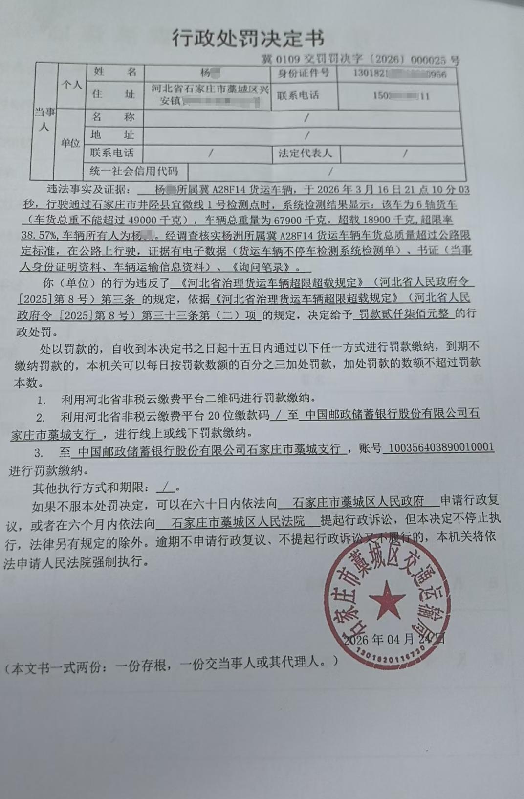 | 杨* | 自然人 | 身份证 | 130182********0956 | 冀0109交罚罚决字【2026】000025号 | 《河北省治理货运车辆超限超载规定》(河北省人民政府令【2025】第8号)第三条 | 杨*所属冀A28F14涉嫌经非现场检测设备检测认定的违法超限运输行为案 | 《河北省治理货运车辆超限超载规定》(河北省人民政府令【2025】第8号)第三十三条第(二)项 | 罚款 | 0.27 | 2026.04.24 | 藁城区交通运输局 | FA06-002-15 |