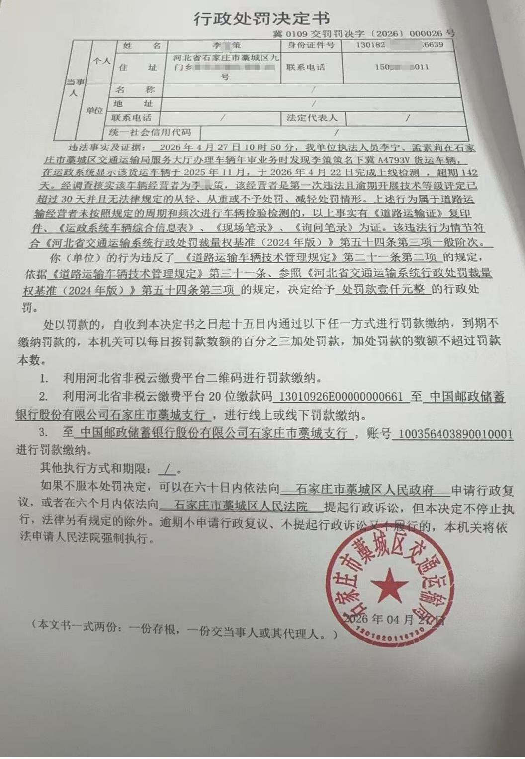 藁城区交通运输局行政处罚公示冀0109交罚罚决字【2026】000026号