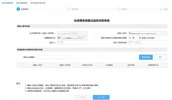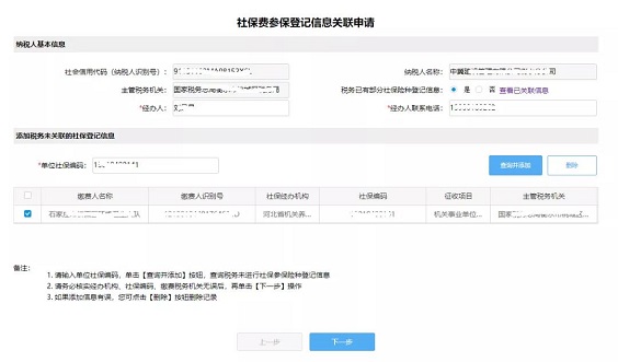 备注:若勾选的缴费人识别号同当前纳税人识别号不一致,会提示:添加的税务未关联社保登记信息缴费人名称,缴费人识别号与当前纳税人不一致。