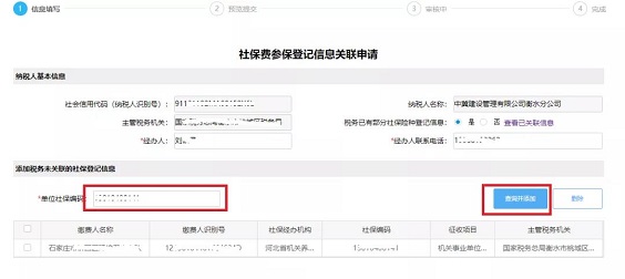 第二步:输入单位社保编码,点击查询并添加。