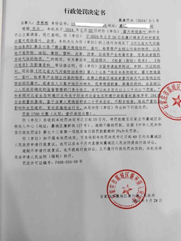 廉州镇表灵村李彬彬露天焚烧落叶案