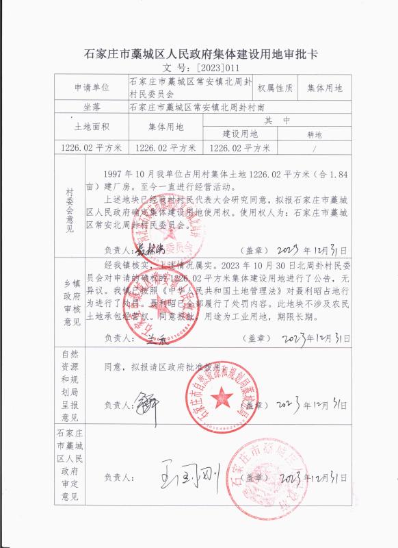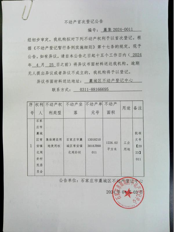 石家庄市藁城区常安镇北周卦村集体建设用地使用权拟登记公告
