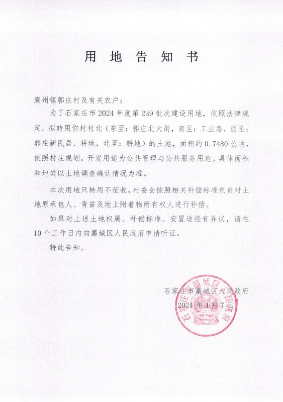 廉州镇郭庄村用地告知书