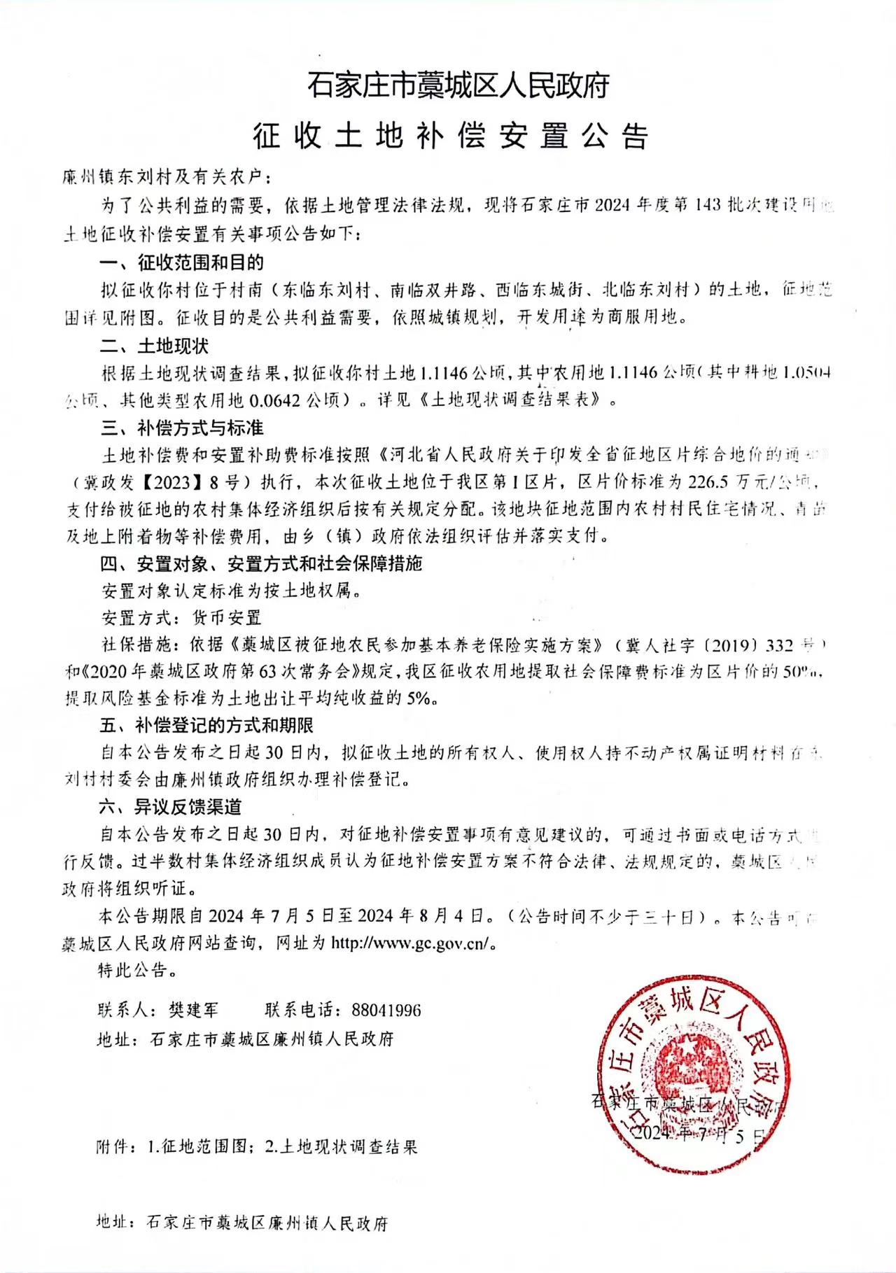 廉州镇东刘村征收土地补偿安置公告