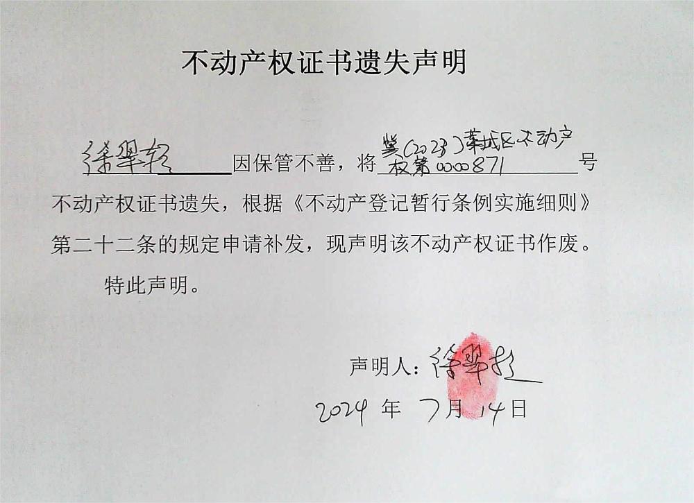 徐翠轻不动产权证书遗失声明