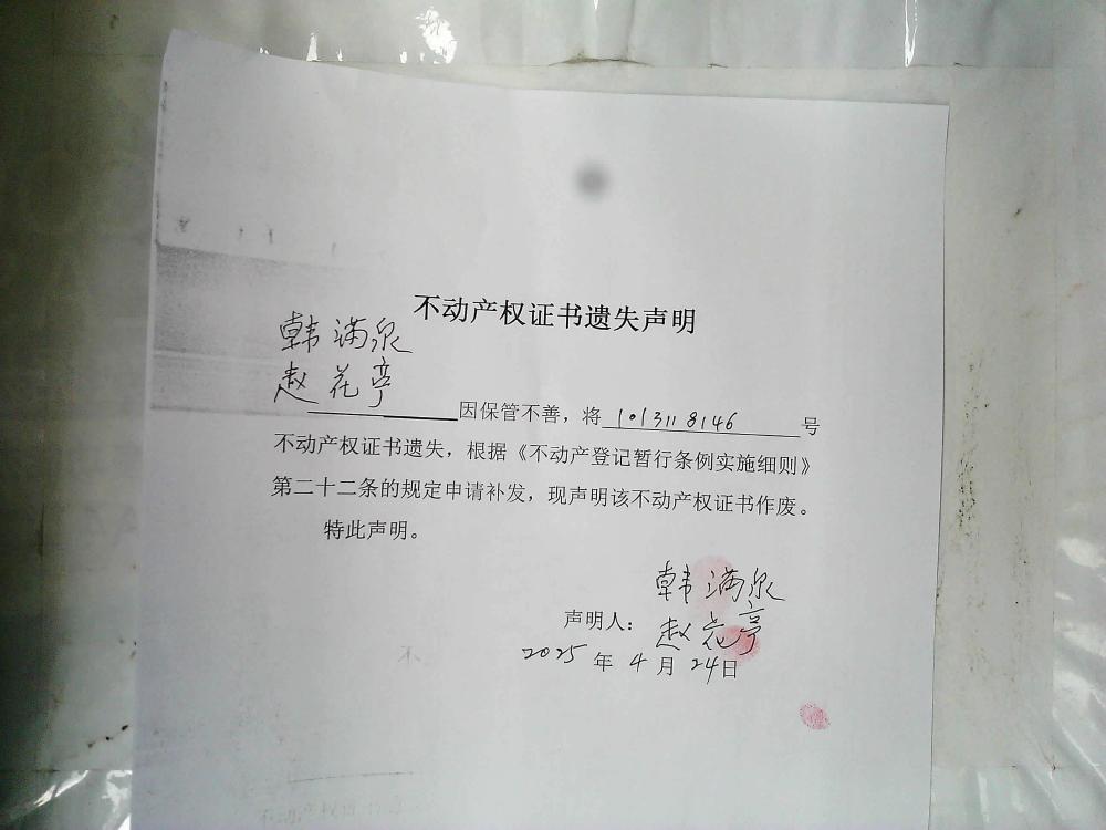 韩满泉、赵花亭不动产权证书遗失声明