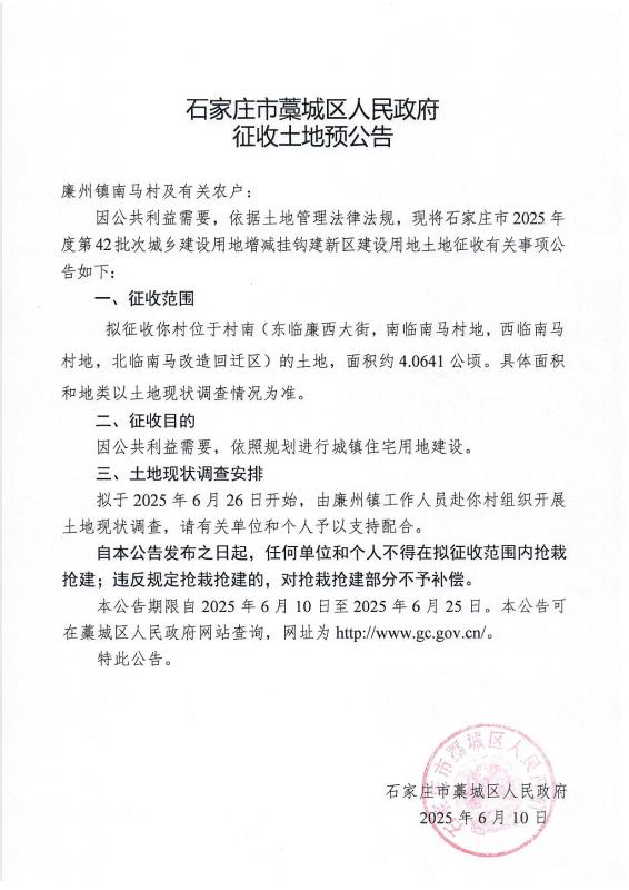 石家庄市2025年度第42批次征收土地预公告