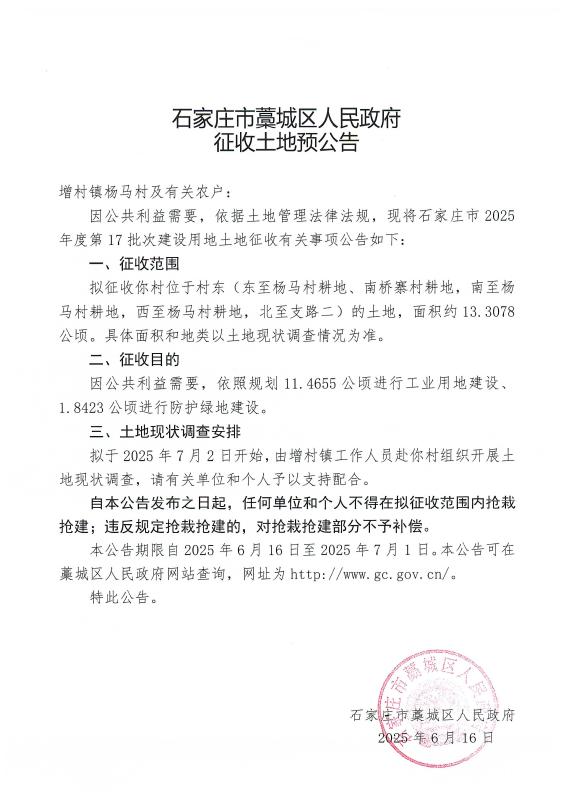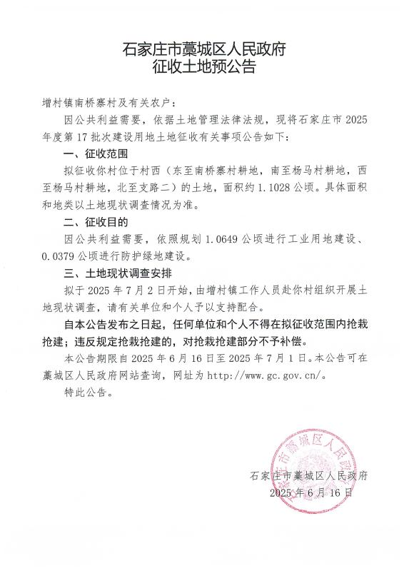 石家庄市2025年度第17批次征收土地预公告