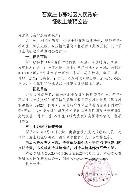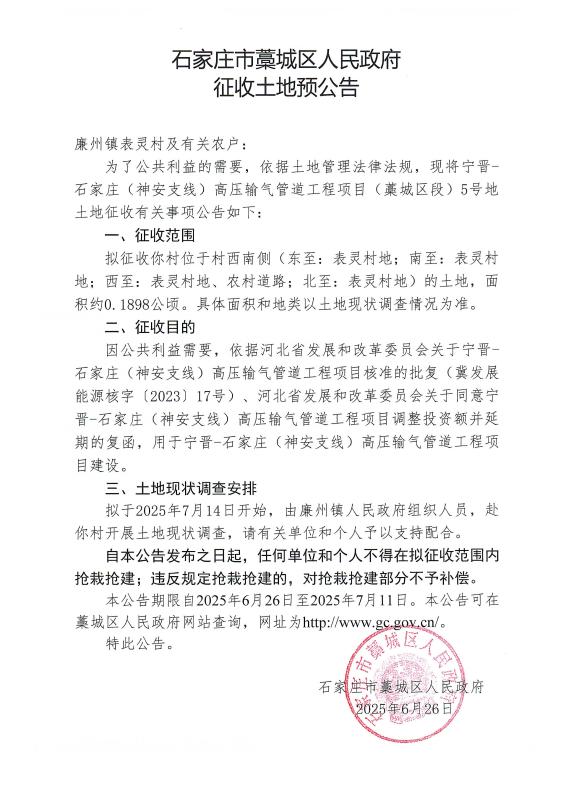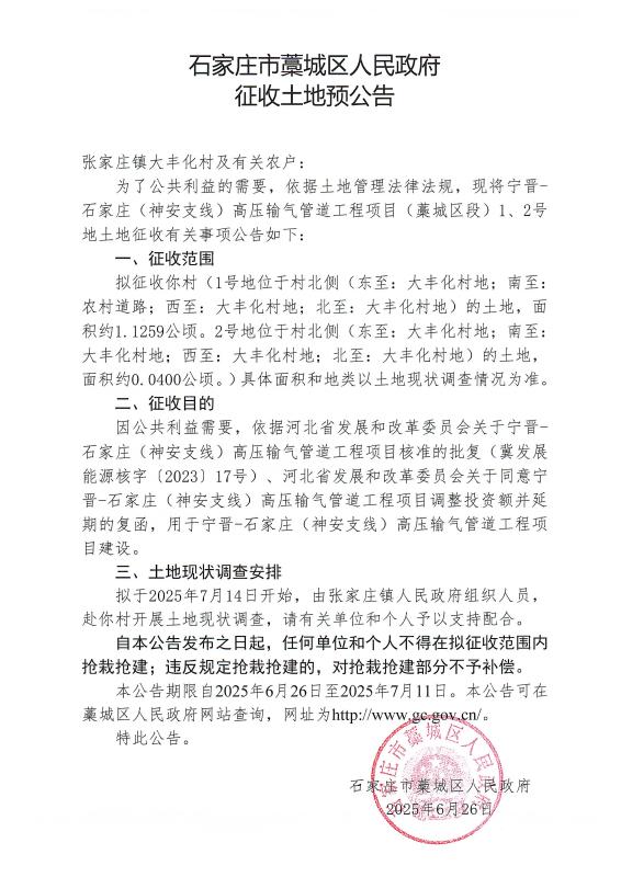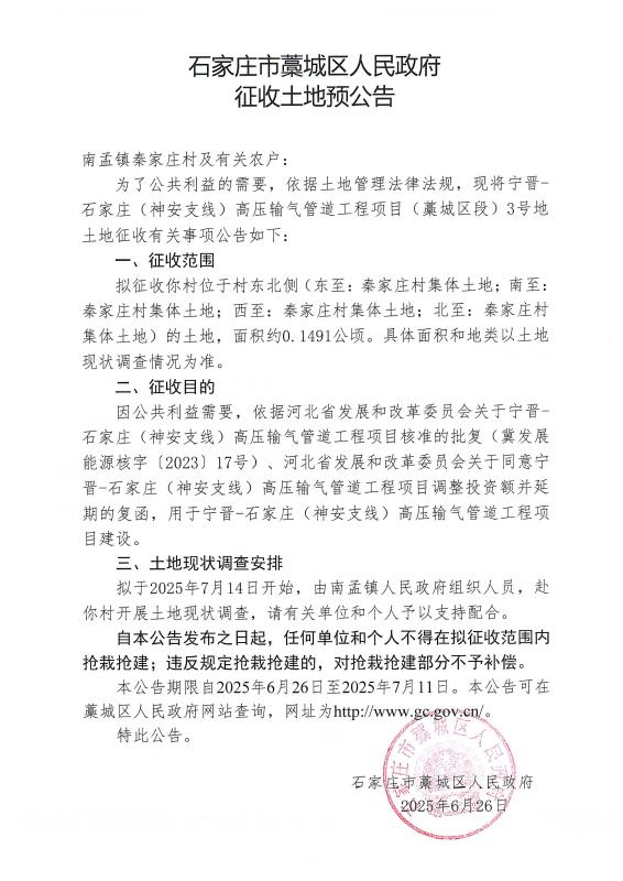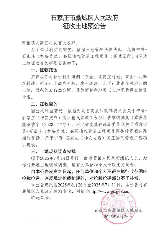 宁晋-石家庄(神安支线)高压输气管道工程项目(藁城区段)征收土地预公告