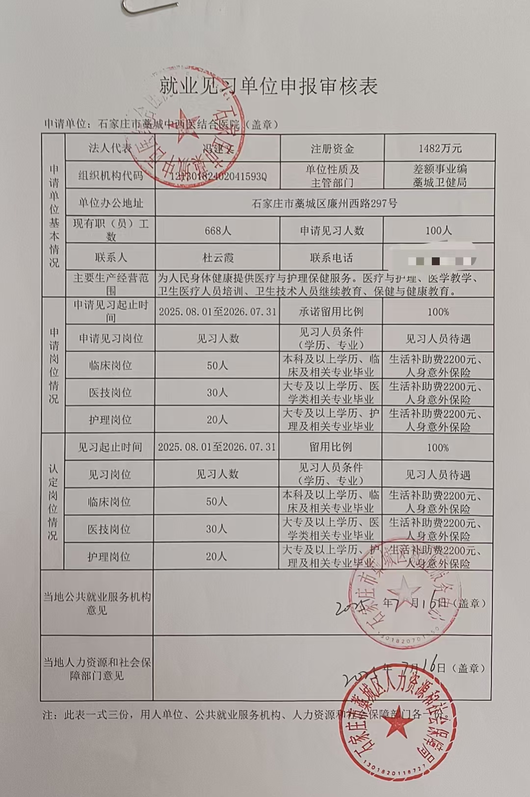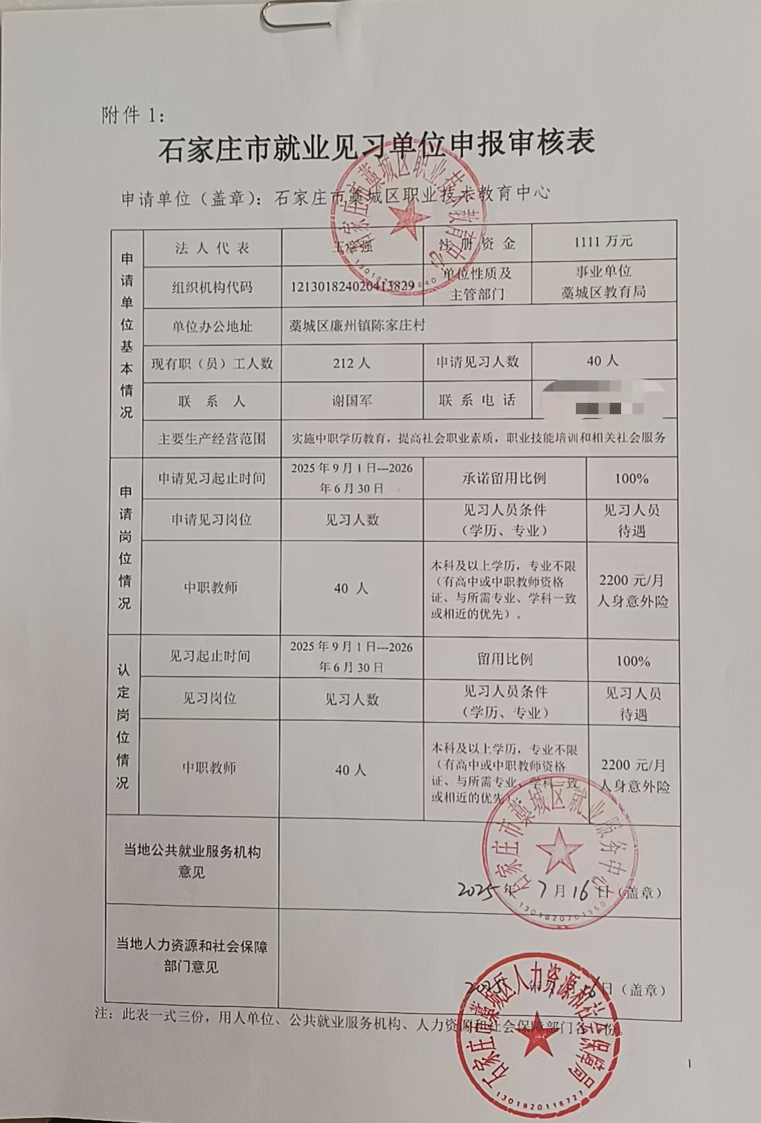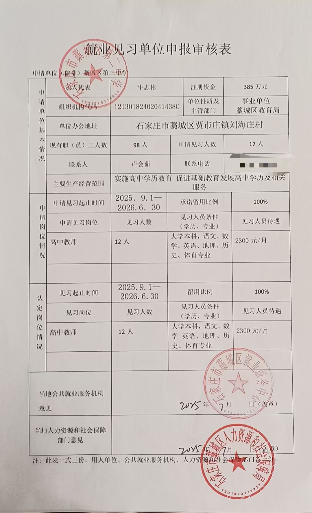 现向社会公示,公示时间:2025.7.16--2025.7.21,公示期间如有异议,请向藁城区就业服务中心反馈,监督电话:0311--88110719,如无异议,可按要求开展见习工作。