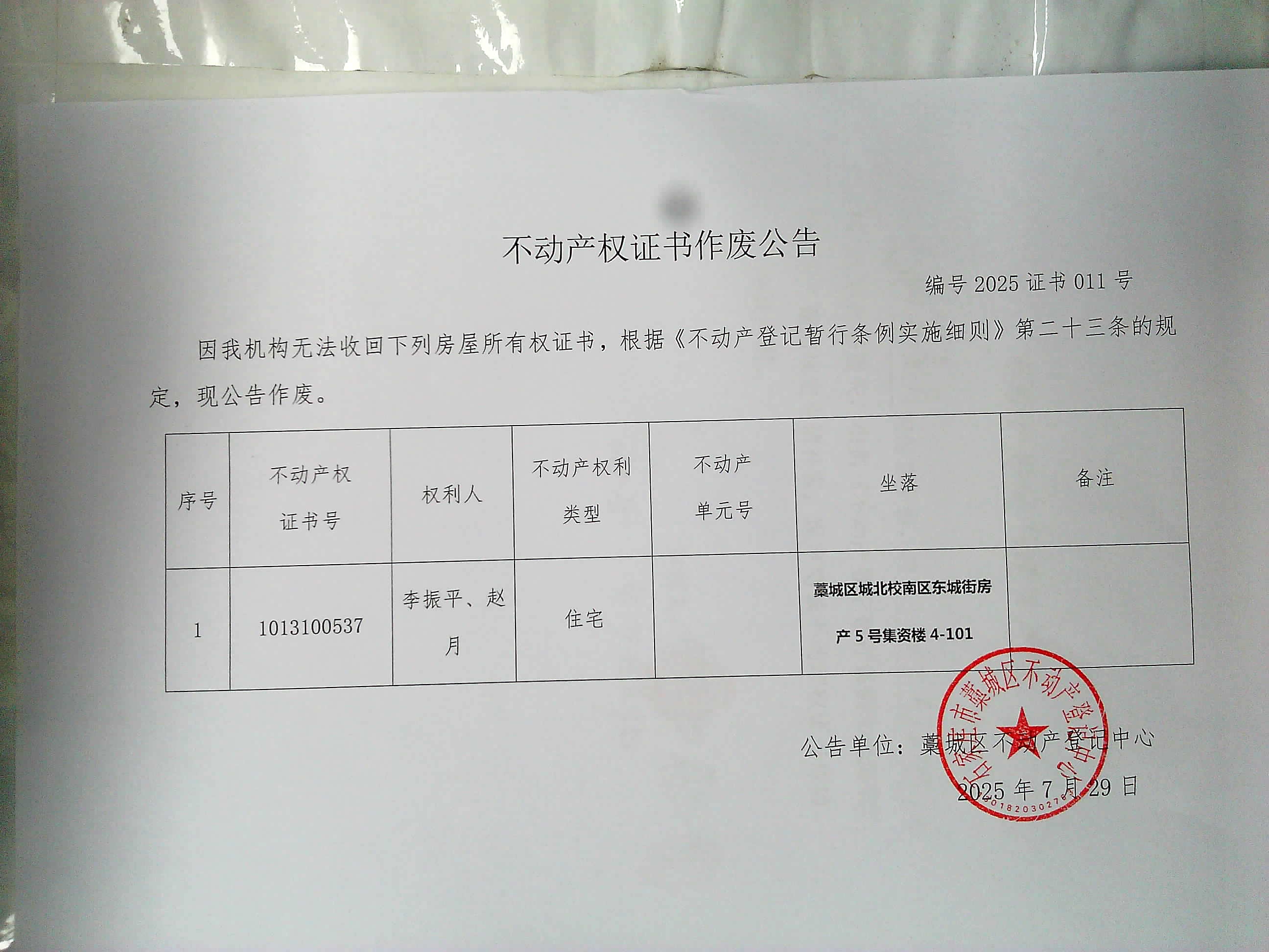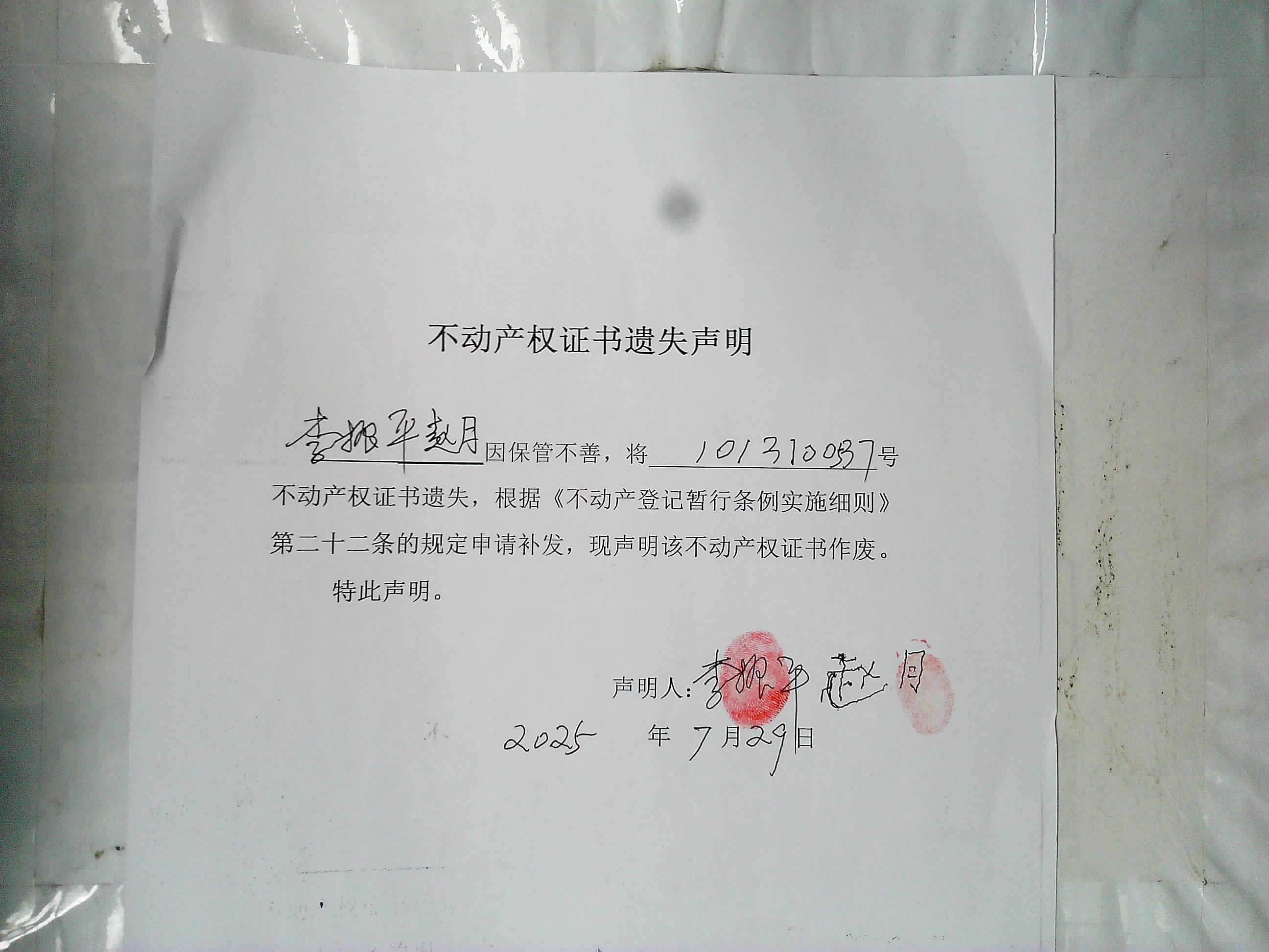 李振平 赵月 不动产权证书作废公告及遗失声明