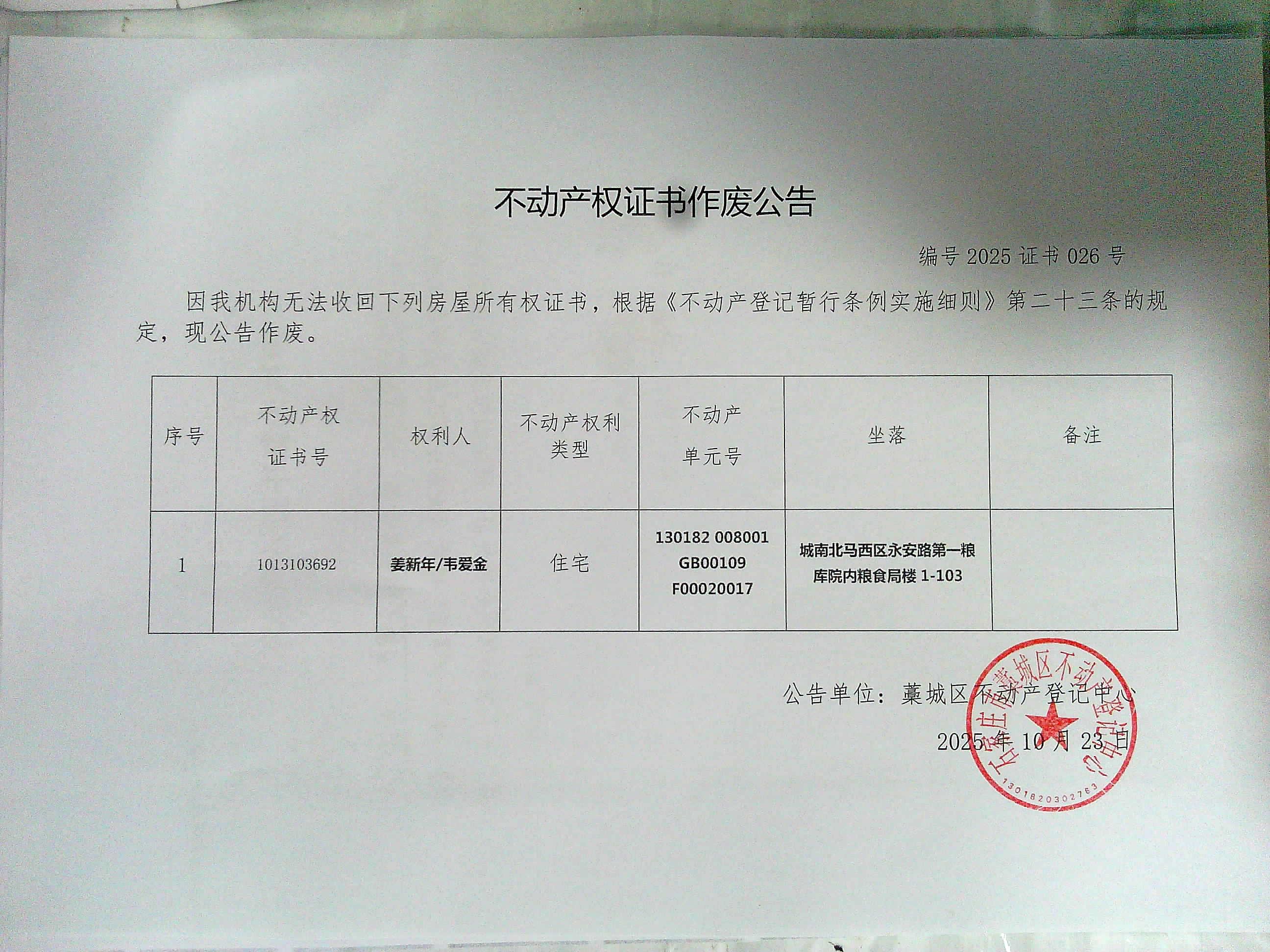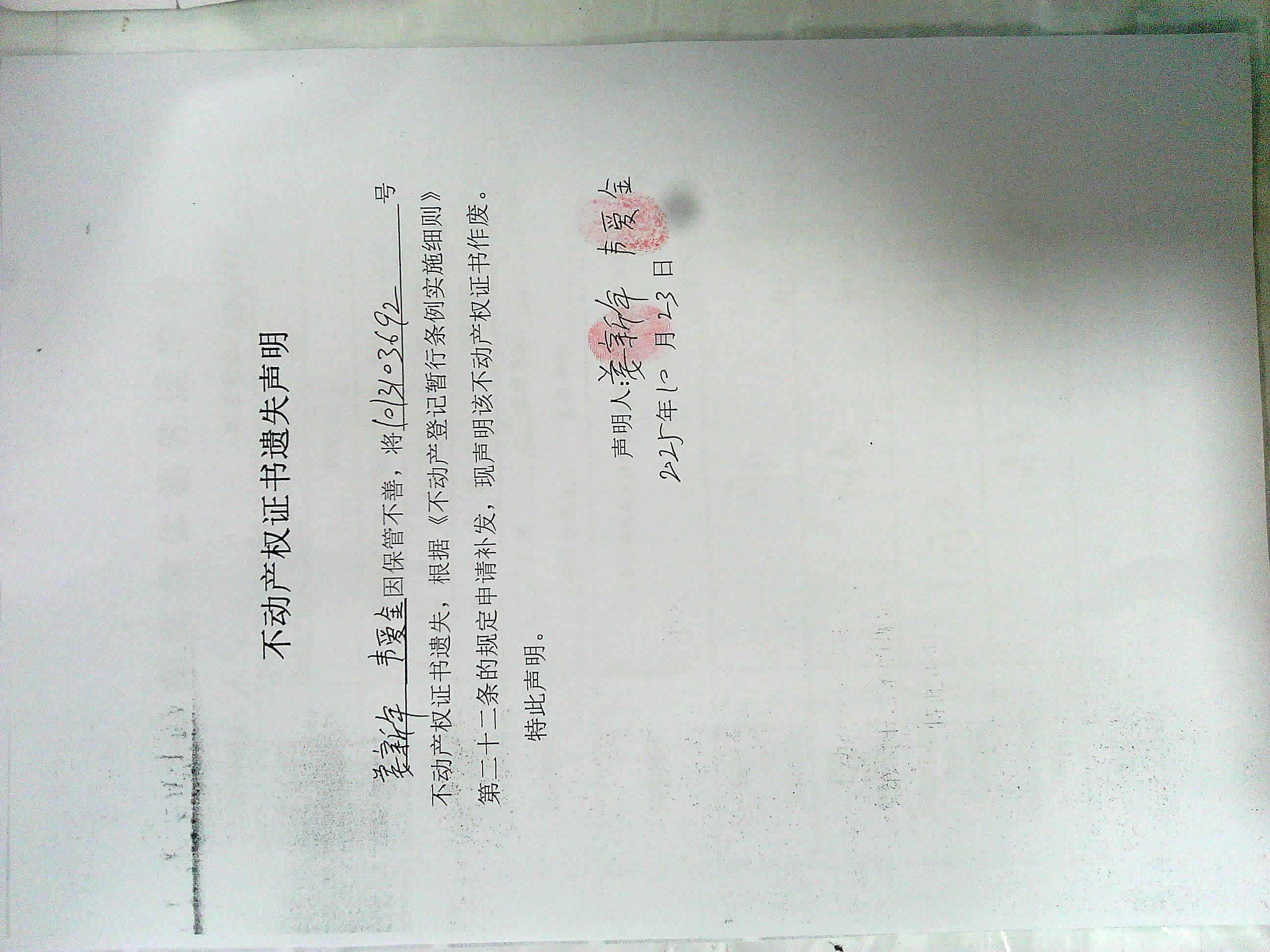 姜新年、韦爱金不动产权证书遗失声明及作废公告