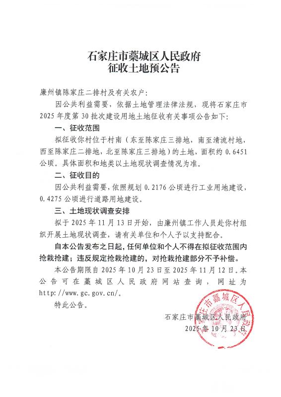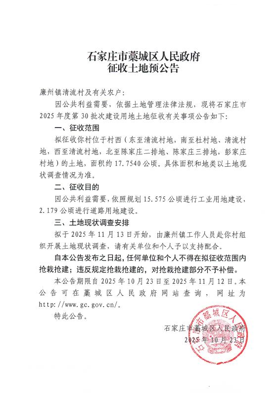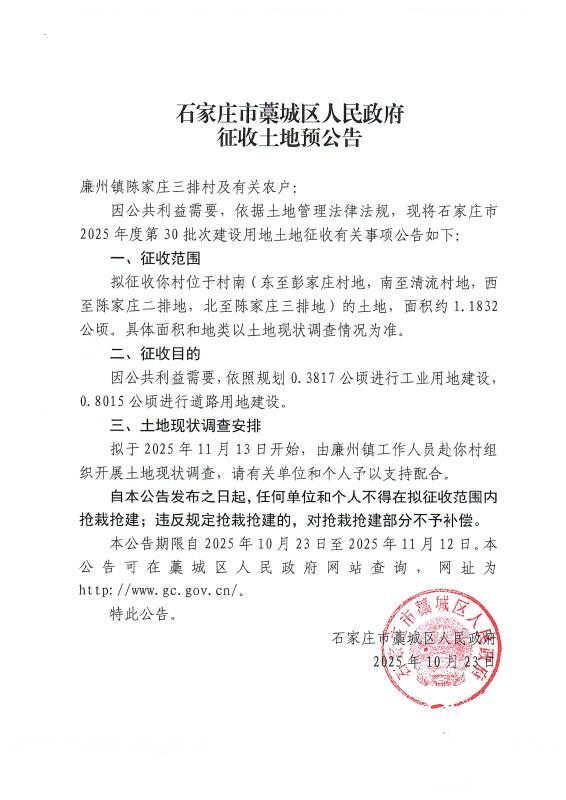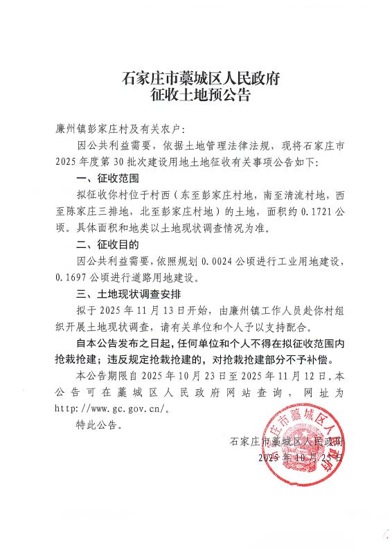 石家庄市2025年度第30批次建设用地征收土地预公告