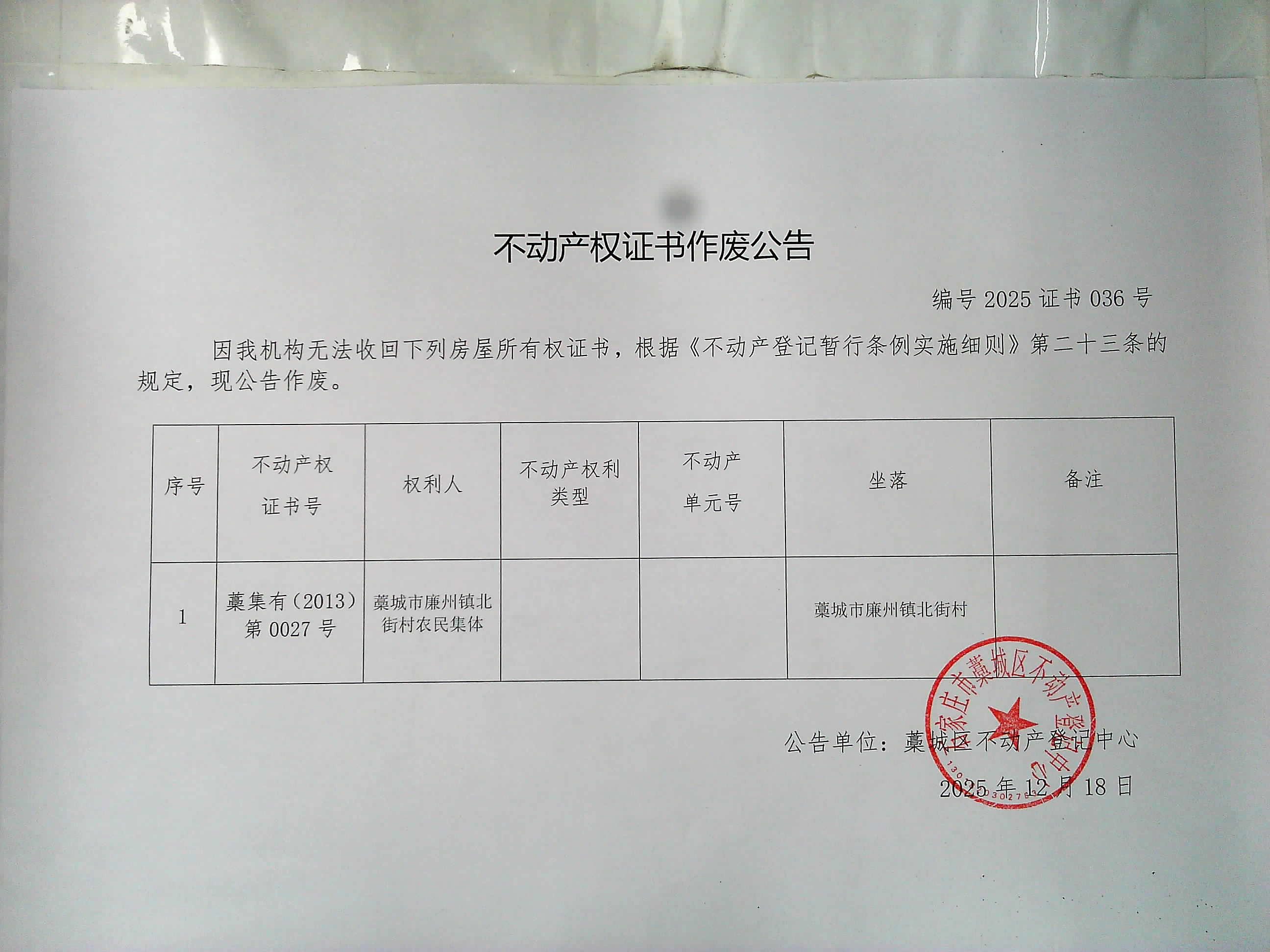 藁城市廉州镇北街农民集体证书作废公告
