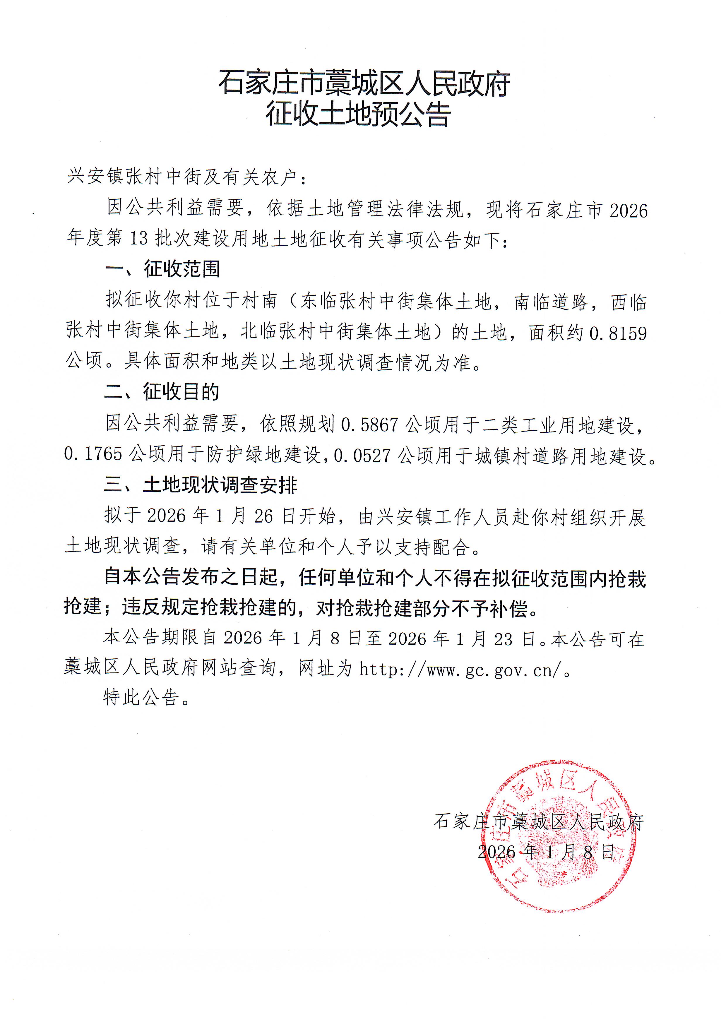 石家庄市2026年度第13批次征收土地预公告