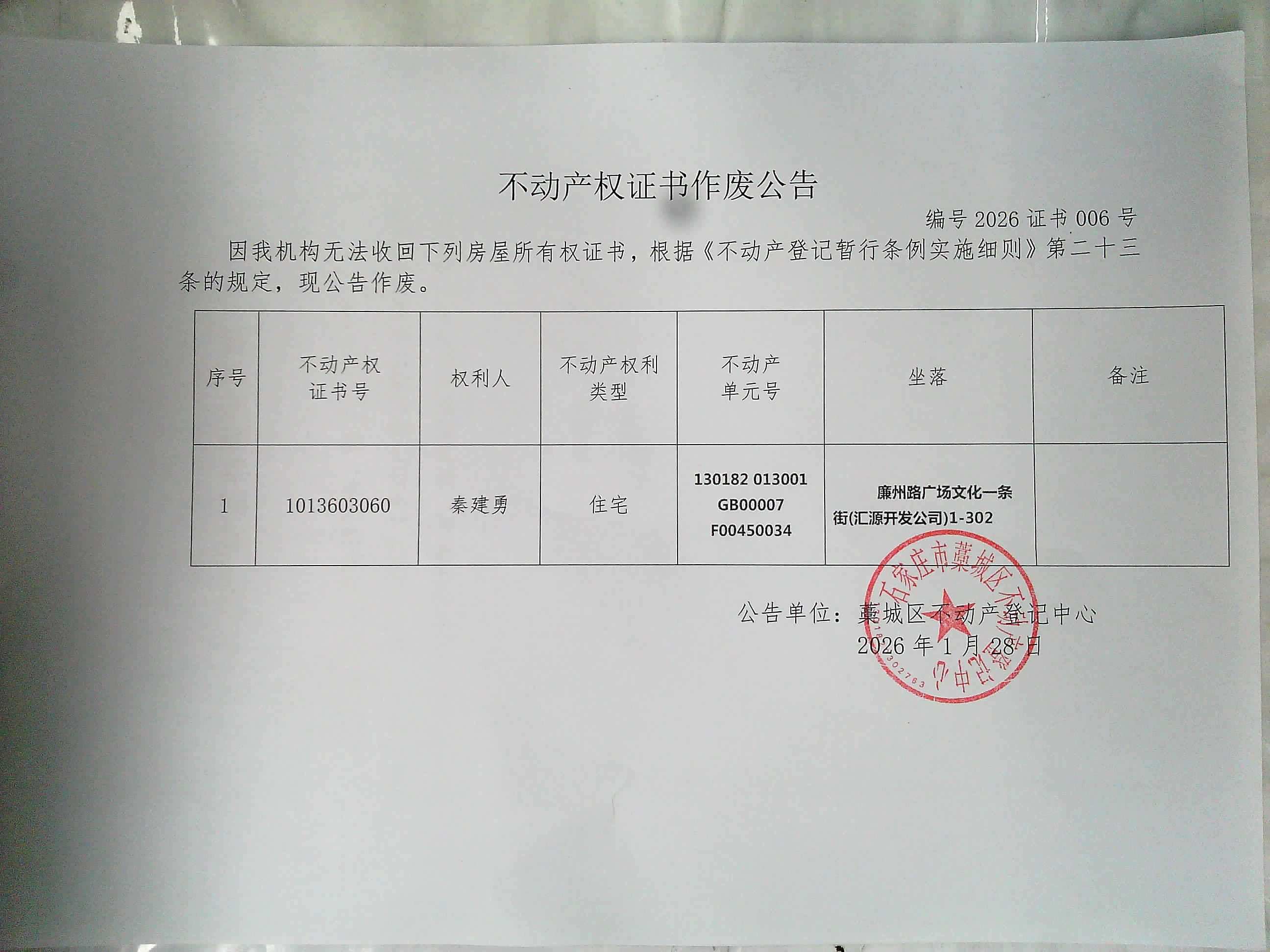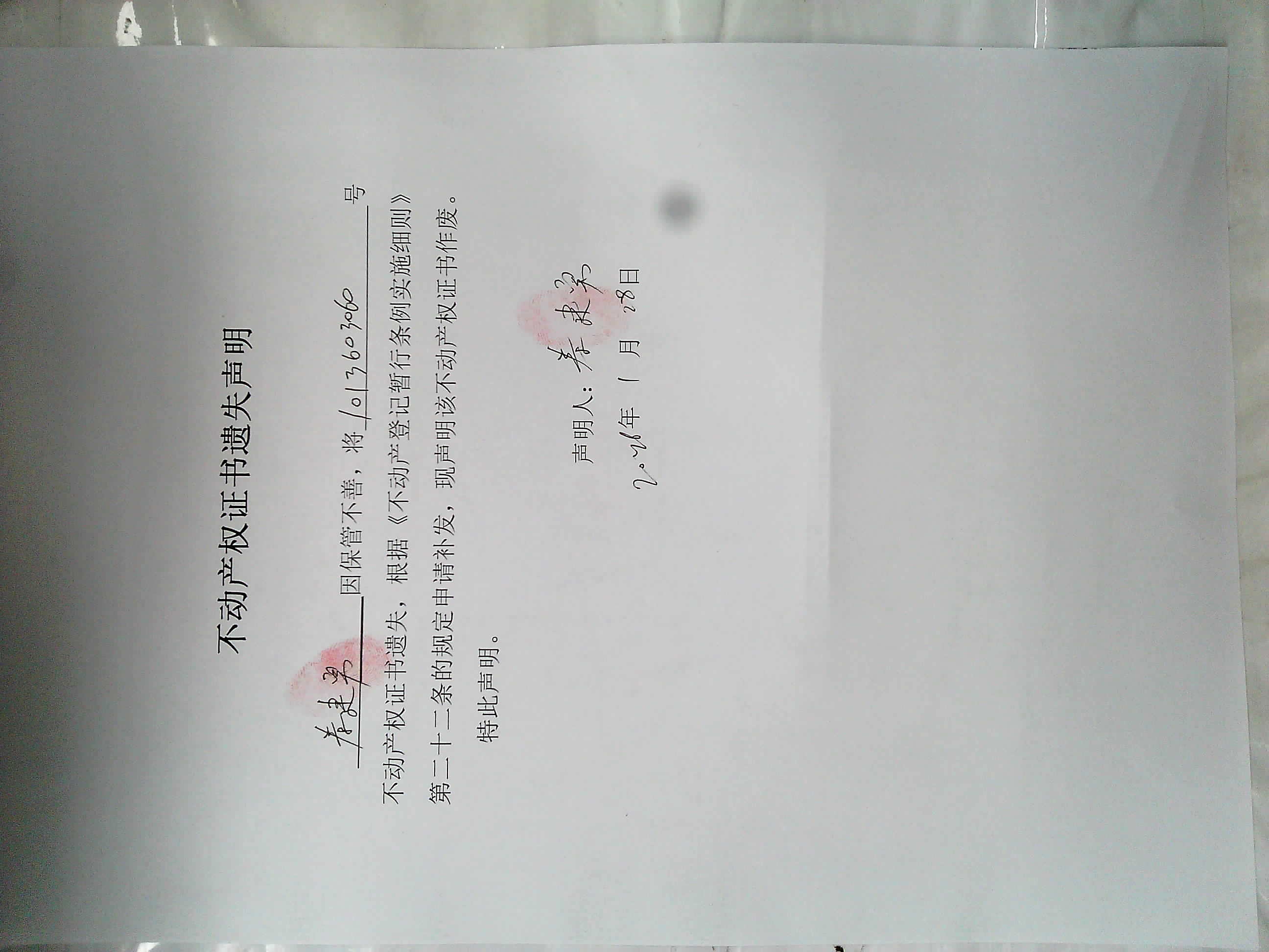 秦建勇 不动产权证书遗失声明及作废公告