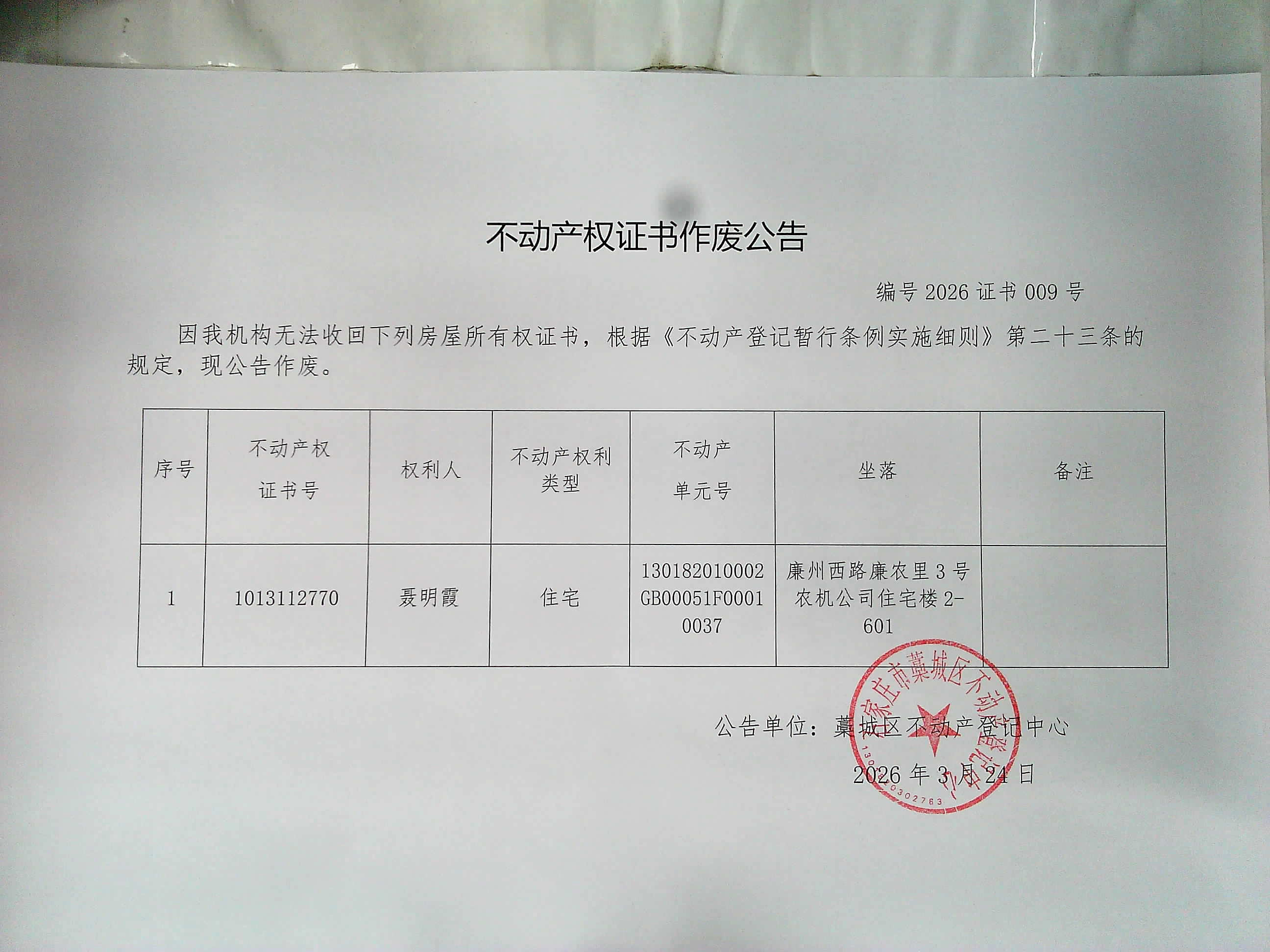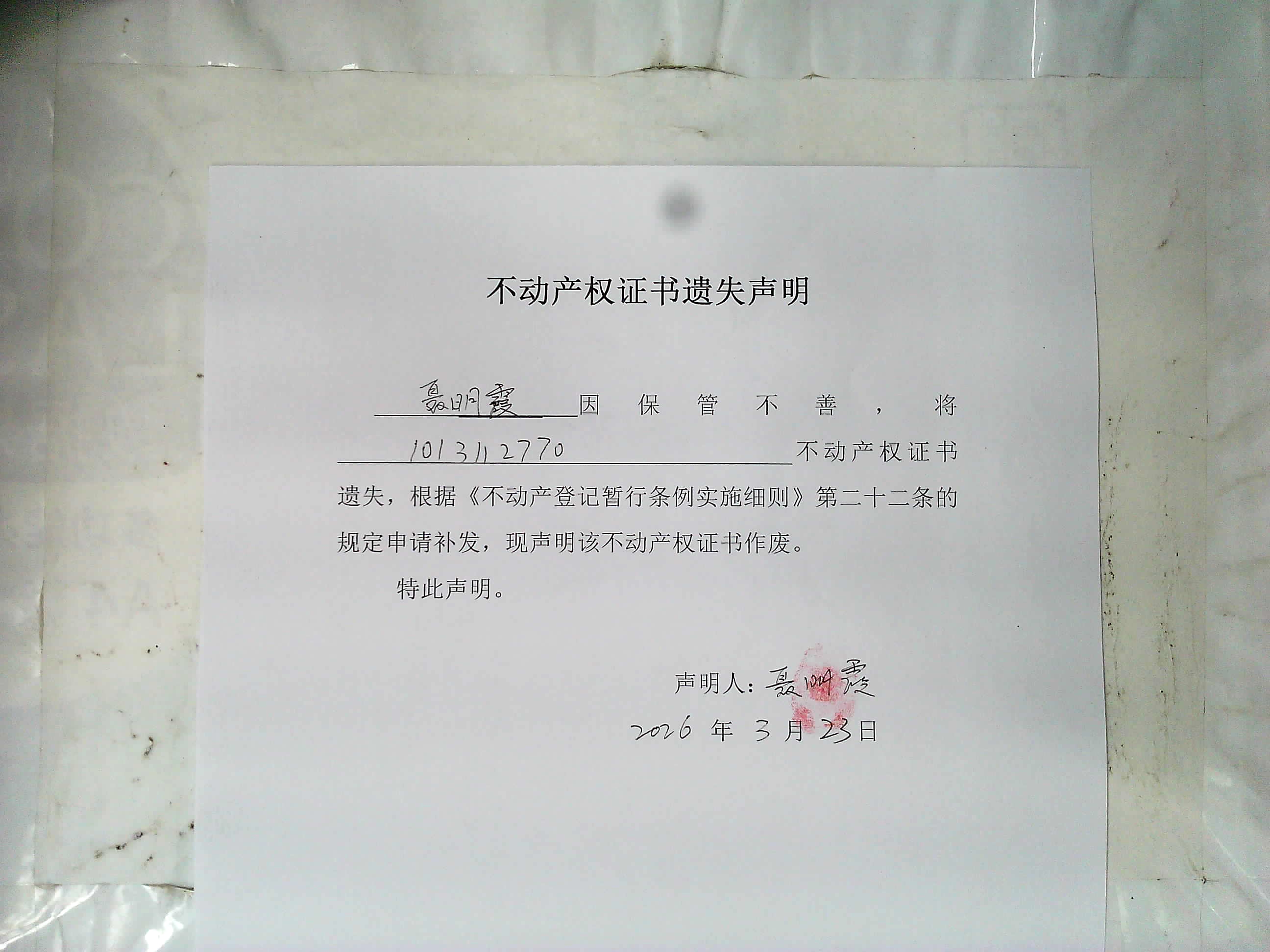 聂明霞不动产权证书遗失声明