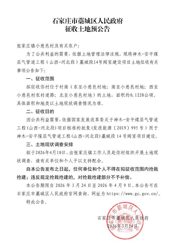 神木-安平煤层气管道工程(山西-河北段)藁城段14号阀室建设项目征收土地预公告