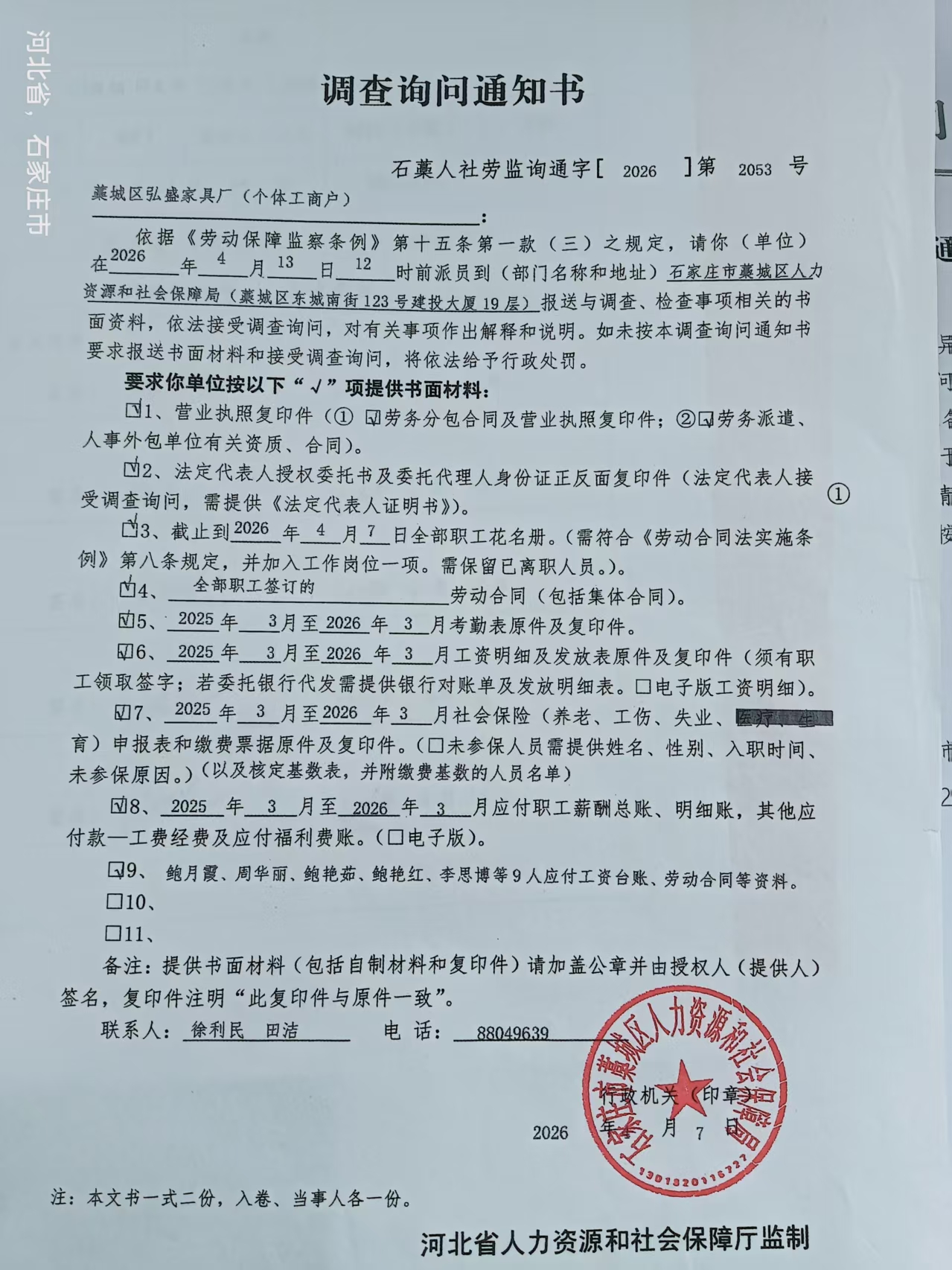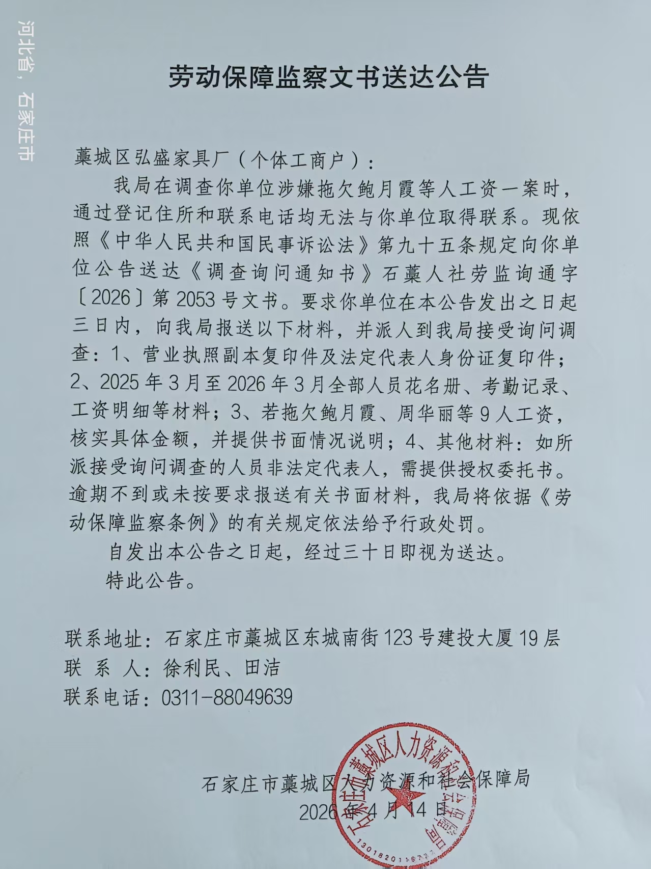 劳动保障监察文书送达公告