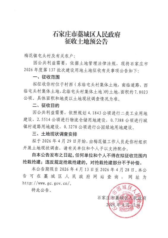 石家庄市2026年度第137批次征收土地预公告