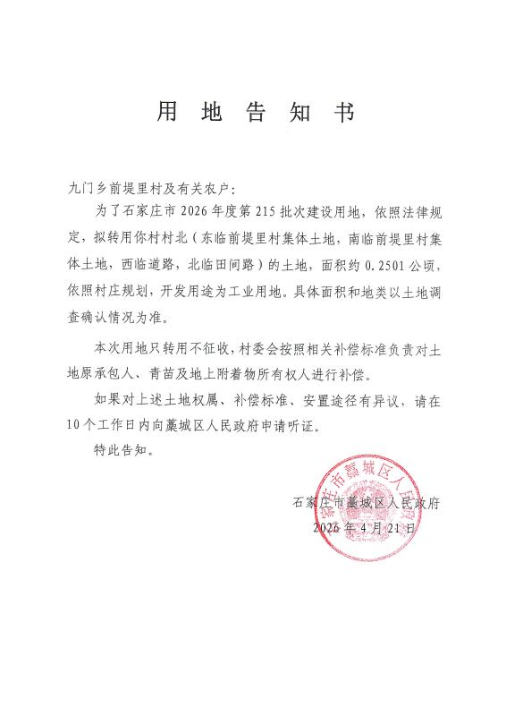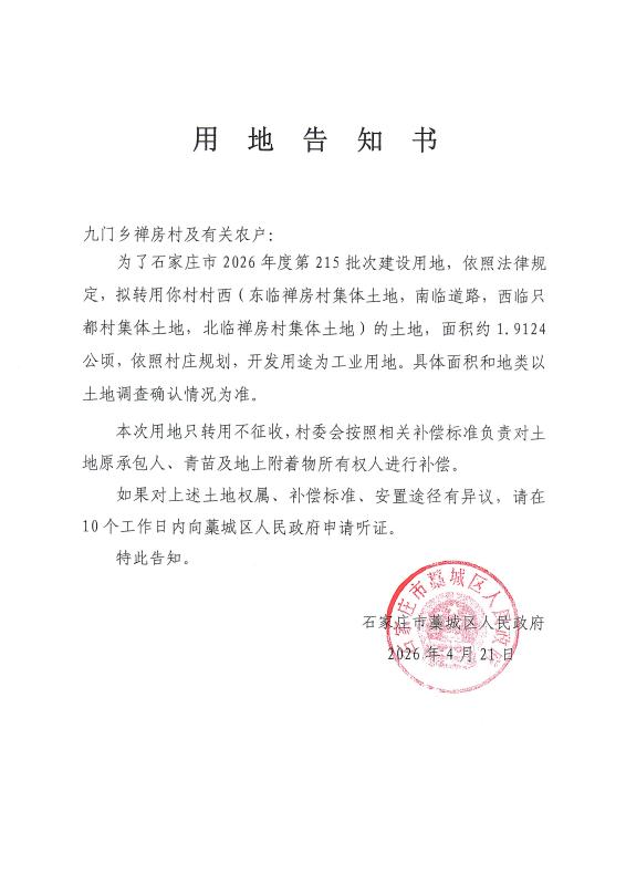 石家庄市2026年度第215批次用地告知书