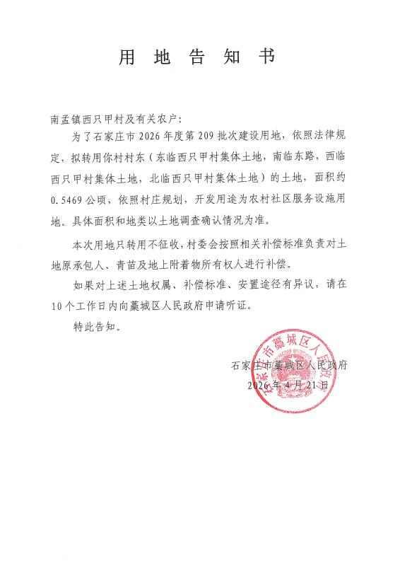 石家庄市2026年度第209批次用地告知书