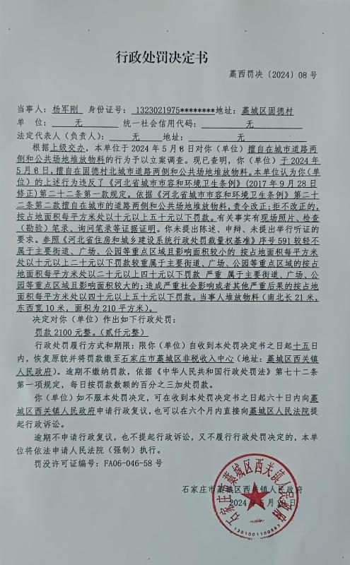 藁城区西关镇固德村杨军刚擅自在道路两侧和公共场地堆放物料案