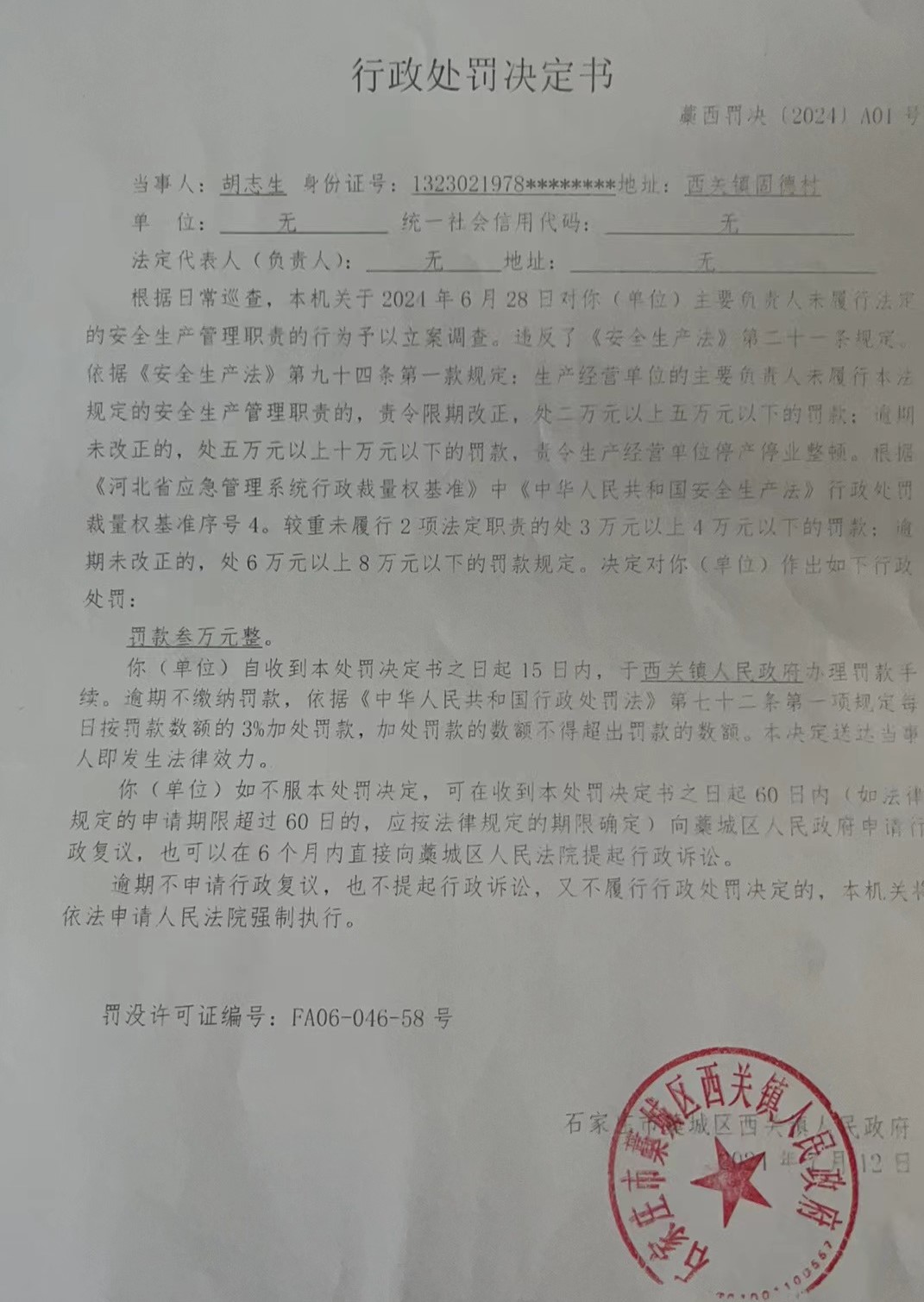 藁西罚决〔2024〕A01号