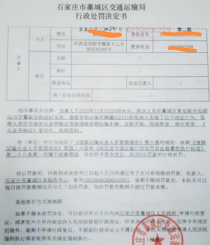 | 郭巍巍 | 个体工商户 | 92130434MAODP8VC1D | 郭巍巍 | 身份证 | 130434********3157 | 冀藳交罚【2022】0220000259 | 违反了《道路运输从业人员管理规定》第十条的规定 | 郭巍巍使用失效的从业资格证驾驶冀D2D121道路货物运输车辆的案 | 依据《道路运输从业人员管理规定》第四十六条和《河北省交通运输行政处罚自由裁量权执行标准》第二十八条第一项的规定 | 罚款 | 0.02 | 2022.11.16 | 藁城区交通运输局 | FA06-002-15 |